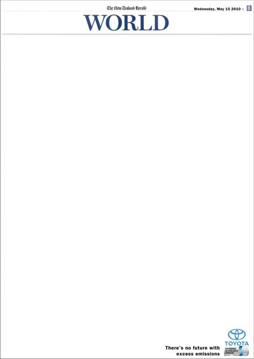 В будущем не будет новостей, потому что ничего не будетИногда и у молодых да зеленых бывают интересные идеи, что в очередной раз доказали ученики школы дизайна и рекламы Axis Ad School, которые разработали этот плакат для японского автомобильного концерна Toyota.Дело в том, что Toyota использует для создания гибридных автомобилей свою собственную разработку под названием Гибридный Синергетический Привод (Hybrid Synergy Drive). Эта силовая установка, основанная на синергетическом эффекте, позволяет существенно снизить выброс вредных веществ в атмосферу, сохраняя таким образом наше будущее… Теглайн: "Нет будущего с чрезмерными выбросами." Агентство: Axis Ad School, Окленд, Новая Зеландия Арт директор: Sarah Comer Копирайтер: Laura Donegan |