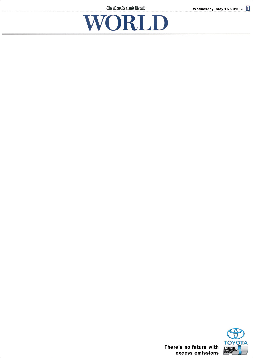 В будущем не будет новостей, потому что ничего не будетИногда и у молодых да зеленых бывают интересные идеи, что в очередной раз доказали ученики школы дизайна и рекламы Axis Ad School, которые разработали этот плакат для японского автомобильного концерна Toyota.Дело в том, что Toyota использует для создания гибридных автомобилей свою собственную разработку под названием Гибридный Синергетический Привод (Hybrid Synergy Drive). Эта силовая установка, основанная на синергетическом эффекте, позволяет существенно снизить выброс вредных веществ в атмосферу, сохраняя таким образом наше будущее… Теглайн: "Нет будущего с чрезмерными выбросами." Агентство: Axis Ad School, Окленд, Новая Зеландия Арт директор: Sarah Comer Копирайтер: Laura Donegan |