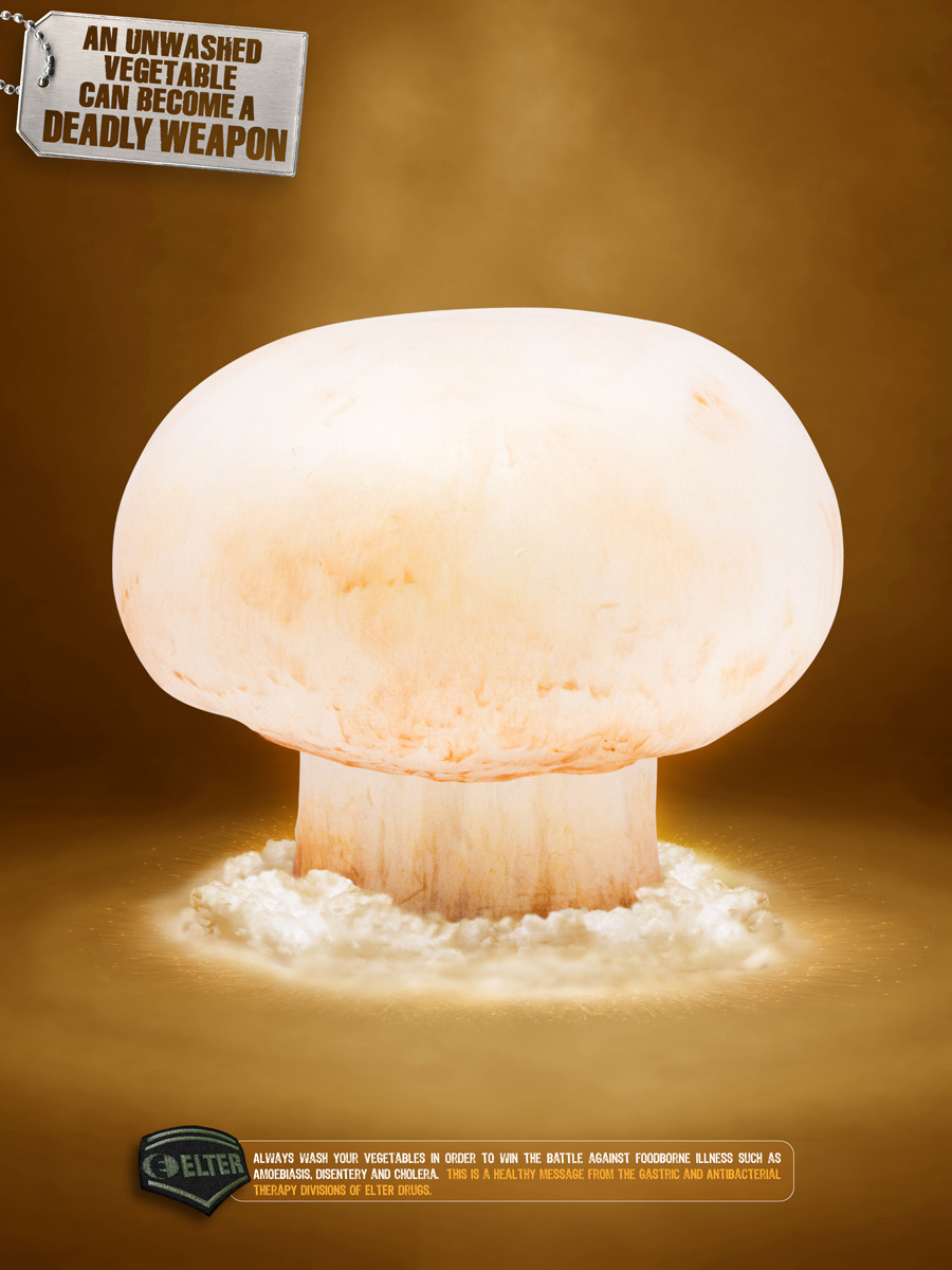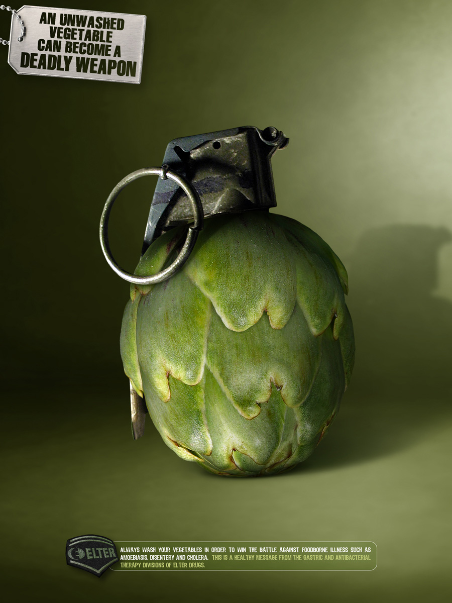 Венесуэльский производитель медикаментов Elter призывает общественность мыть овощи перед едой, дабы не пасть жертвами "оружия"Овощи, которые агентство из Венесуэлы AW Nazca Saatchi & Saatchi превратило в бомбы и гранаты, несут простой месадж от компании Elter - мойте овощи и фрукты перед употреблением. Иначе они превращаются оружие, которое постарается вас убить с помощью холеры и дизентерии.Немытые овощи могут стать смертельным оружием Агентство: AW Nazca Saatchi & Saatchi, Caracas, Venezuela Креативный директор: Roberto Rico Арт директор: Tonatiuh Arturo G?mez Копирайтер: Jes?s Gonz?lez Фотограф: Harold Gonz?lez |