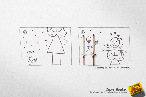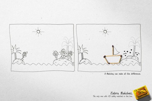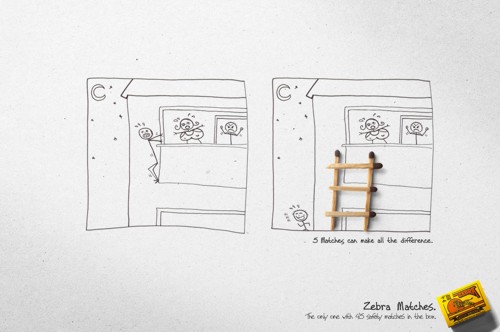 Zebra matches: 5 очень важных спичекЕсли вы попали в затруднительное положение и, казалось бы, спасения ждать особо неоткуда - не стоит отчаиваться, спички Zebra придут на помощь. Кампания от Original Studio показывает потребителю на что способны всего 5 спичек, а уж если их целый коробок (45), то волноваться вообще не стоит.Даже 5 спичек имеют большое значение, а в коробке их 45 Агентство: Original Studio, Curitiba, Brazil Креативный директор: Victor Beuren Иллюстратор: Fernando Castro Копирайтер: Z? Lu?s Schmitz |