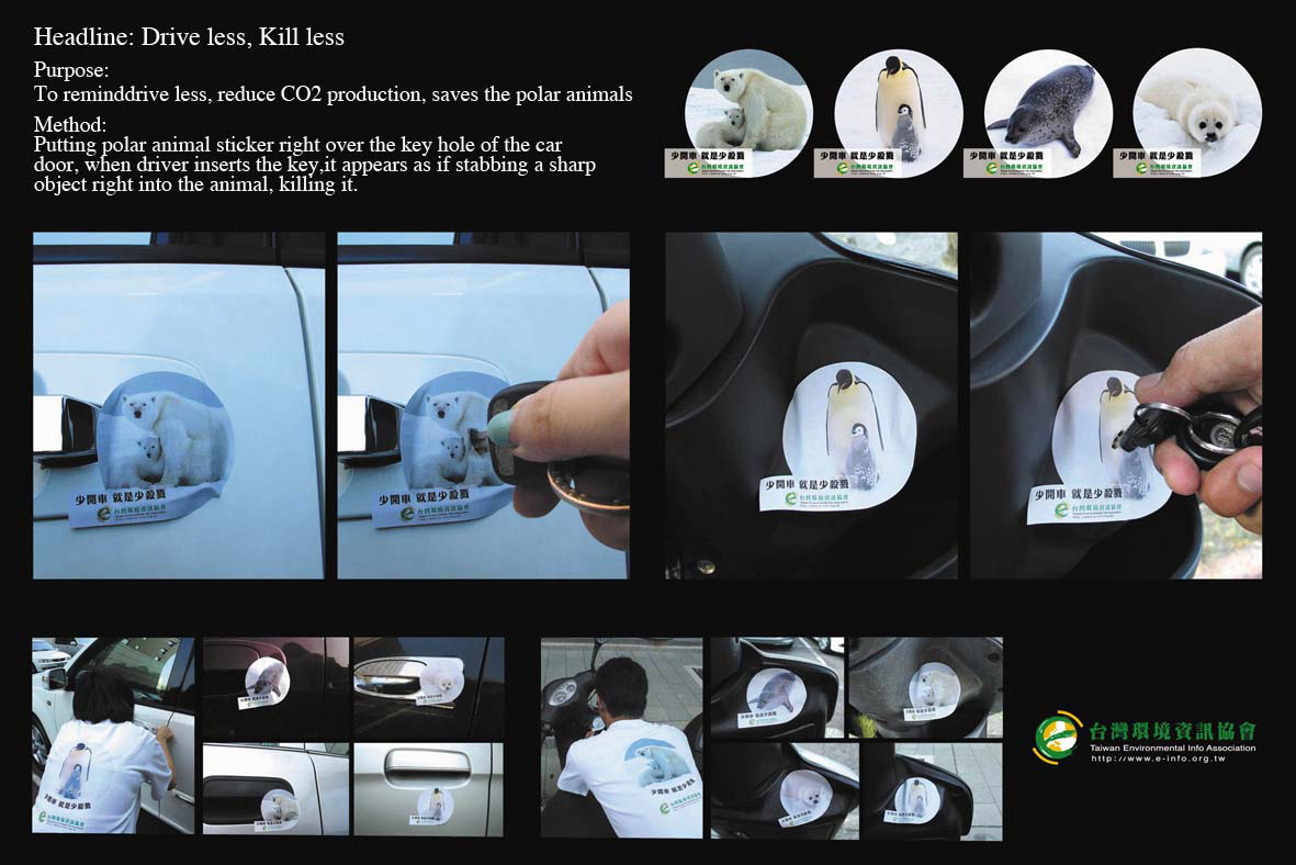 TEIA: вставляя ключ в замок зажигания, вы убиваете животных!Необычную социальную кампанию по защите окружающей среды подготовило тайваньское агентство Eurorscg для ассоциации TEIA (Taiwan Environmental Information Association). Заклеив дверные замки автомобилей и замки зажигания скутеров стикерами с изображением животных, агентство тем самым призывает меньше пользоваться транспортом, дабы меньше портить экологию.Созданная в июле 2001 года, некоммерческая неправительственная организация TEIA, являющаяся независимым источником массовой информации, состоит из активистов, посвятивших себя защите окружающей среды. Начав свою деятельность с освещения местных и международных экологических новостей, статей и колонок в газетах, листовок, а так же трансляций online, TEIA стал крупнейшим экологическим информационным ресурсом в Тайване, оставаясь при этом совершенно бесплатным и общедоступным для каждого. Теглайн: "Меньше езди, меньше убивай." Агентство: Eurorscg, Тайбэй, Тайвань Творческий директор: Fish Chen, George Liou Арт-директор: Tom Huang, Kiki Liu Копирайтер: Eve Tsai |
