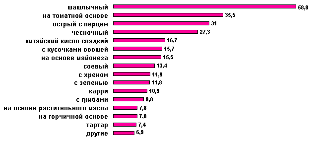 Диаграмма 1: Потребление кетчупа и покупных соусов за последние полгода. 1 по данным MMI - опрос проводился в 20 городах Казахстана с населением 100 тыс. и более среди людей в возрасте от 15 лет и старше. Объем выборки составил 3000 респондентов. В какой бы стране мира ни готовилась вкусная и здоровая пища, без соуса ей не обойтись. С соусом она становится ароматнее, сильнее возбуждает аппетит. Производители предлагают широкий выбор видов соуса, благодаря чему потребители получают возможность приготовить в домашних условиях изысканные блюда. По данным Media Marketing Index, шашлычный соус является лидером в потреблении (см. диаграмму 2). Диаграмма 2: Предпочтения по типу покупных соусов Казахстанский рынок изобилует количеством марок кетчупов и покупных соусов как отечественного, так и импортного производства. Наиболее популярными марками кетчупа и покупных соусов по знанию и потреблению среди потребителей данного продукта являются: "3 желания" - данную марку знают 63,1%, потребляют 47,6%. На втором месте по знанию и потреблению находится "Балтимор" - его знают 61,3%, потребляют 48,4%. Третье место занимает марка "Цин-Каз", уровень потребления данной марки - 38,2%, потребления - 26,0% (см. диаграмму 3). Диаграмма 3: Наиболее известные и потребляемые марки кетчупа и покупных соусов: TOP 5 Рассмотрим стиль жизни потребителей кетчупов и покупных соусов. Наиболее предпочтительным видом отдыха для данной группы потребителей являются: спортивные состязания, бильярд, боулинг, компьютерные игры. Наименее популярным видом отдыха для потребителей кетчупа и покупных соусов являются: шитье, рукоделие, посещение церкви, участие в богослужениях, посещение медицинских учреждение (см. диаграмму 4). Диаграмма 4. Стиль жизни потребителей кетчупа и покупных соусов. Кетчупы и соусы как нельзя, кстати, могут помочь разнообразить наш стол зимой, добавив в наши привычные блюда некой экзотики и красок. Еще одним аргументом в пользу кетчупа и томатных соусов может послужить тот факт, что помидоры и красный перец, являющиеся основными компонентами натурального кетчупа, содержат вещества, обладающие выраженным противораковым действием. TNS-GLOBAL.KZ |