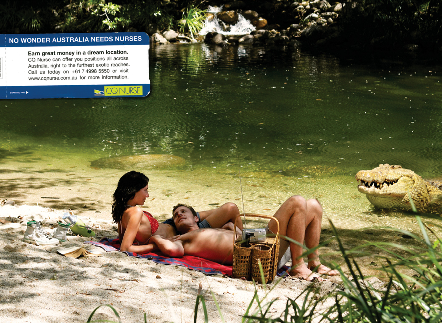 Медсестра - путешественникЕсли вы медсестра, вам открыта вся Австралия, вас ждут самые живописные места. В условиях дефицита медработников ведущее австралийское агентство по набору медсестер CQ Nurse решило привлечь их нестандартным аргументом. Работа медсестры рассматривается как возможность путешествовать и заработать хорошие деньги. "Мы покажем вам первозданную Австралию и дадим развиваться профессионально, - говорит агентство на своем сайте. Оно также обещает учитывать пожелания работников и предоставлять им полную информацию о месте назначения.Состав творческой группы: Агентство: M&C Saatchi Auckland Креативный директор: Paul Taylor Копирайтер: Ben Pegler Арт-директор: Rene Van Wonderen |