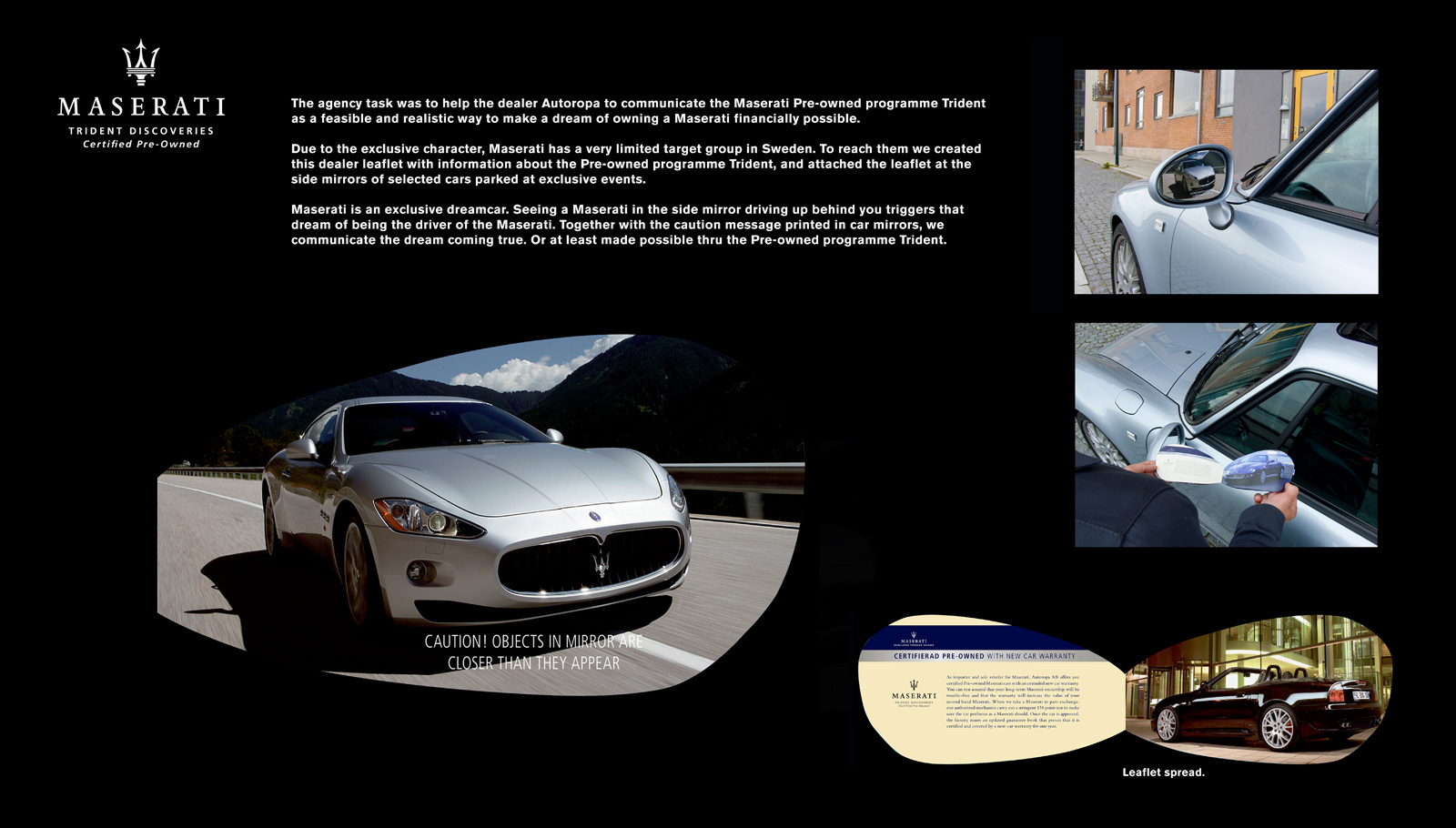 Мечты о Maserati могут осуществиться… в ШвейцарииМечта об автомобиле Maserati может стать реальной. А поможет в этом швейцарское агентство McCann и официальный дилер этой марки в Швейцарии Autoropa, представляющие вниманию ЦА новую программу Trident, суть которой заключается в продаже поддержанных автомобилей марки Maserati. Брошюры размером с боковое зеркало размещались на избранных автомобилях, припаркованных около зданий, где в этот момент проводились эксклюзивные мероприятия. На титульной стороне помещалось изображение автомобиля Maserati, а внутри буклета давалось описание данной программы по продаже поддержанных автомобилей. Заметим, что идея креатива на боковых зеркалах вовсе не нова, так, например, канадские креаторы из РА Marshall-Fenn по заказу магазина велосипедов Sweet Pete's призывали водителей быть более внимательнее именно с помощью зеркал. Агентство: McCann, Мальмё, Швеция |