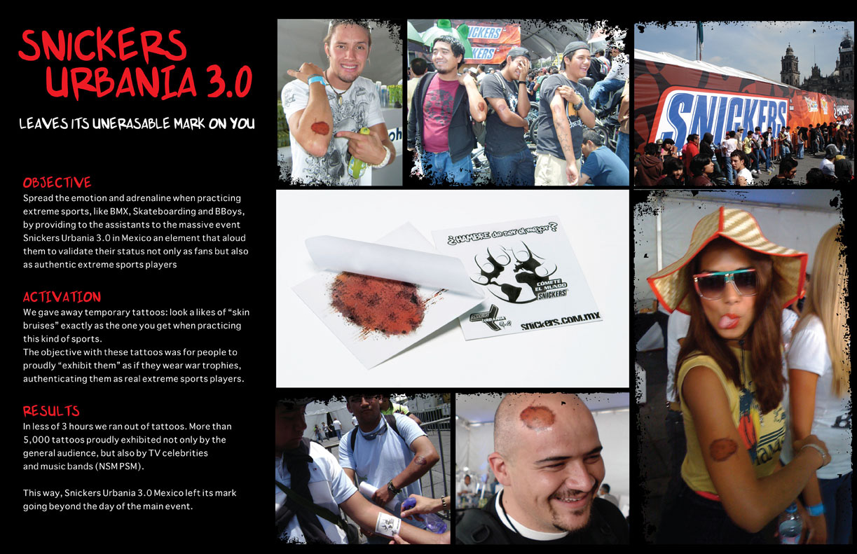 Snickers Urbania оставляет неизгладимые следы на теле фанатовSnickers Urbania - ежегодный фестиваль объединенной уличной культуры, включающий такие направления, как экстремальный спорт, граффити, брейк-данс, паркур и др. В России приводится уже 8-ой раз и известен, как Сникерс Урбания. Цель фестиваля - дать возможность современной молодежи заявить о себе и о своем таланте.Благодаря мексиканскому агентству Proximity, фестиваль Snickers Urbania 3.0 оставил в Мексике "неизгладимый" след в виде кровавых ран и ссадин на теле фанатов. Такой эффект обеспечили специально созданные по такому случаю временные татуировки с изображением ушиба. Агентство: Proximity, Мексика Творческий директор: Gerardo Rangel Арт-директор: Juan Carlos Palacios, Rebeca Fern?ndez, Elizabeth Ju?rez Копирайтер: Eduardo Vel?zquez, Isaac Barrera |