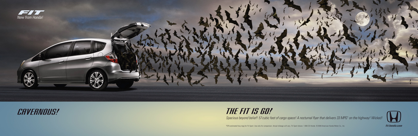 Honda Fit - автомобиль, у которого багажник размером с пещеруБагажное отделение размером в 57 кубических футов, стильный дизайн, новейшее оборудование и удивительно эффективный расход топлива - это те качества, которые позволяют автомобилю Honda Fit вырваться далеко вперед в конкурентной борьбе, считает американское агентства RPA.Агентство: RPA, Santa Monica, USA Креативный директора: David Smith, Joe Baratelli, Pat Mendelson Фотограф: Markku Lahdesmaki |