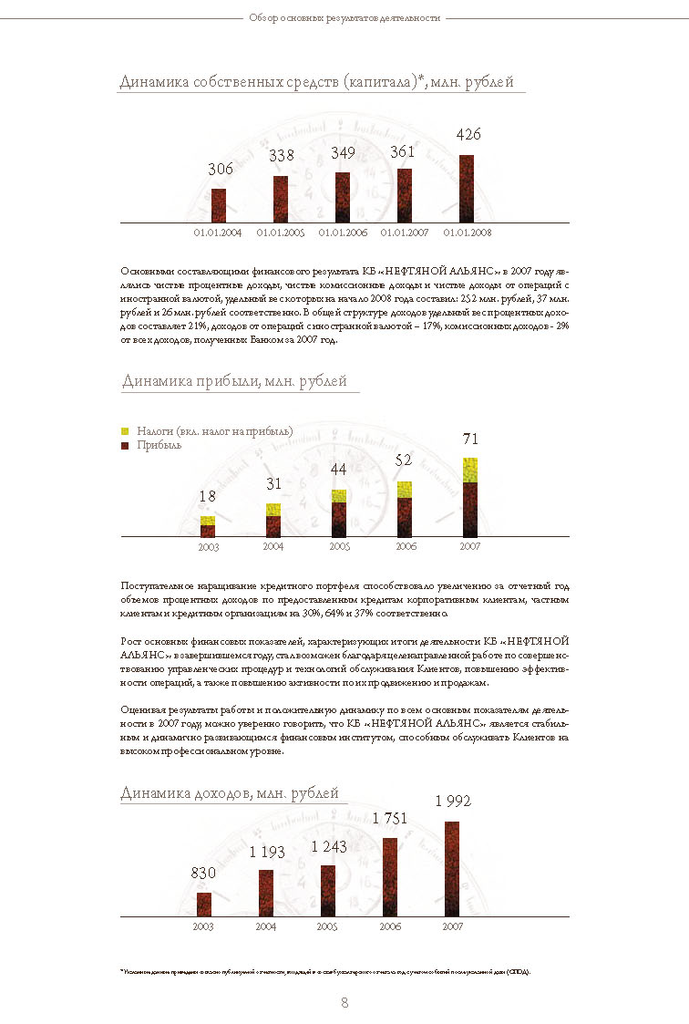 Рекламный Альянс "Cabrio" разработал годовой отчёт для КБ "Нефтяной альянс"Рекламный Альянс Cabrio завершил работу по созданию годового отчёта за 2007 год компании КБ "Нефтяной альянс". Документ предназначен для акционеров, клиентов, партнеров, а также других заинтересованных лиц, и содержит информацию о деятельности банка и финансовых результатах прошедшего года.Перед специалистами Cabrio было поставлено несколько задач: разработать креативную концепцию отчёта, отражающую точность и надёжность банка, осуществить дизайн, вёрстку и печать продукта. В основу дизайна годового отчёта Рекламным Альянсом "Cabrio" было предложено концептуальное решение - "работа банка как механизм работы часов". В результате отчёт получился строгим, понятным и отражающим характер банка. Сотрудничество КБ "Нефтяной альянс" с Рекламным Альянсом "Cabrio" осуществляется уже на протяжении 3-х лет. |