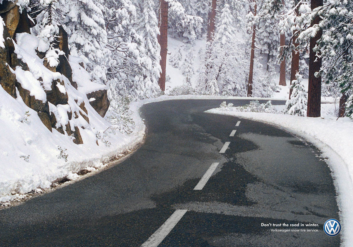 Volkswagen советует не доверять зимней дорогеВсе рулевые, тормозные и ускоряющие силы между машиной и дорогой проходят через шины. Благодаря ним машина держит дорогу, а водитель ее контролирует. И никто не будет отрицать, что роль шин в безопасности машины особенно важна в суровых или быстро меняющихся условиях, в особенности на снегу или на льду. Итальянское креативное агентство DDB с помощью этой рекламной кампании представляет специальный сервис шипованных шин от концерна Volkswagen и еще раз напоминает водителям, что дорога зимой может быть обманчива. Итальянцы из DDB сотрудничают с Volkswagen уже не первый год, представляя не только автомобили этого концерна, но и разнообразные услуги, начиная непосредственно с сервисных центров и заканчивая дополнительной страховкой. Теглайн: «Не доверяй зимней дороге. Сервис шипованных шин Volkswagen.» Агентство: DDB, Милан, Италия Акимова Анна, Sostav.ru |
