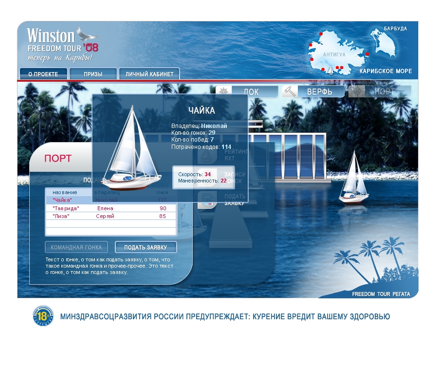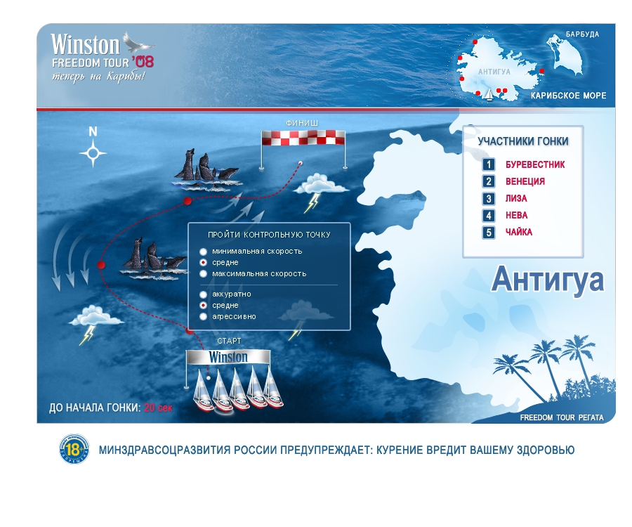 Winston отправил курильщиков кататься на яхтеWinston Freedom Tour регата 2008 – многопользовательская он-лайн игра, выпущенная брендом Winston для любителей парусных гонок и сигарет Winston. Суть игры заключается в следующем: участник регистрируется на сайте http://game.winston.ru и получает стандартную яхту, которая пришвартована в чудесной бухте где-то на Карибских островах. Каждый яхтсмен может оборудовать и улучшить свою яхту, в обмен на специальные коды, размещенные на пачках Winston. Чем больше яхтсмен «вкладывал» в свою яхту, тем больше были его шансы на победу в зрелищных он-лайн заездах с другими игроками в реальном времени. Для участия в гонках игроку нужно было купить топливо на коды, которые также располагались на сигаретных пачках Winston. Каждую неделю (в течение 2 месяцев) лучшим яхтсменам вручались призы от Winston. Среди потребителей продукции Winston виртуальная парусная регата вызвала большой интерес – более 13 000 человек стали участниками парусных гонок, приняв участие в 54 000 заплывов. Регата Winston Freedom Tour 2008 еще один пример брендинговых он-лайн игр, которые становятся в последнее время интересным трендом на рекламном рынке. Игра создана и разработана интернет холдингом Interactive Solutions, одним из первых разработчиков брнединговых-онлайн игр на российском рынке. Увидеть Winston Freedom Tour вы можете здесь |