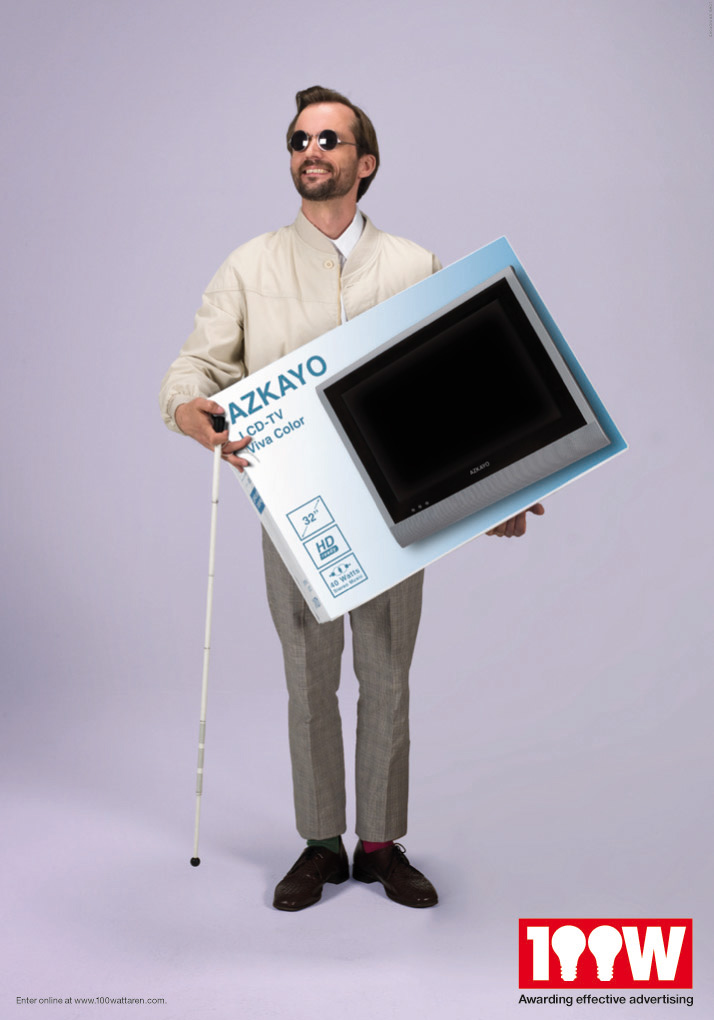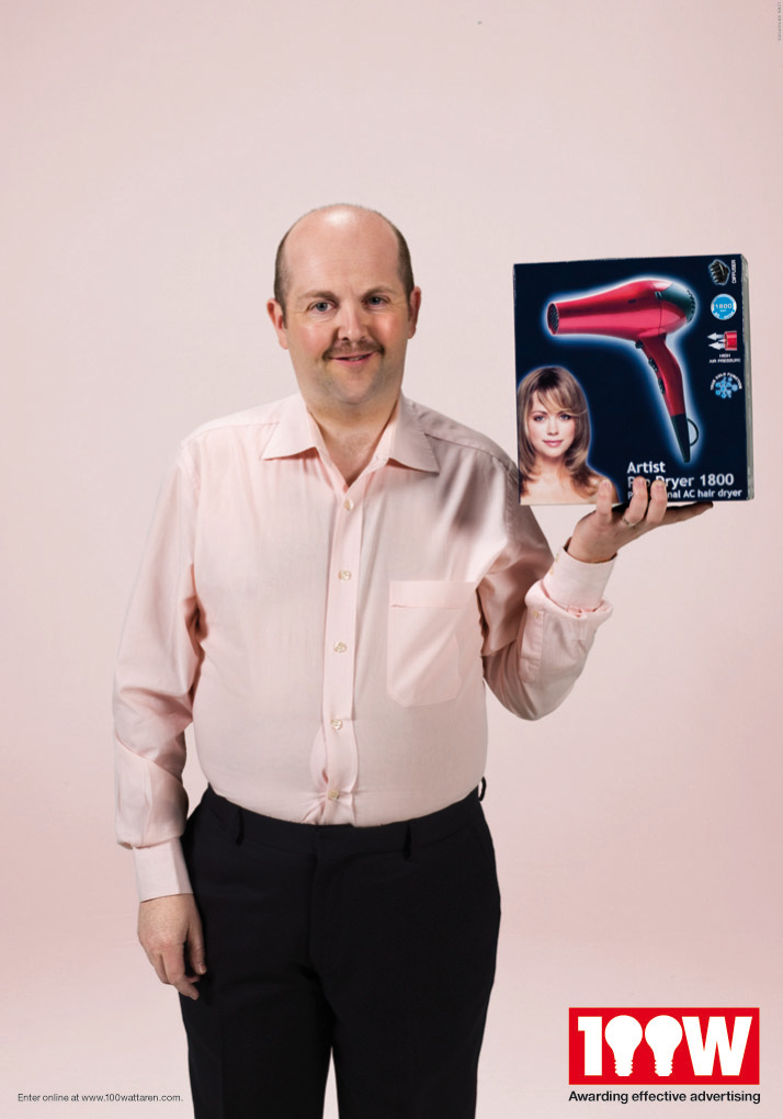 Шведское агентство Lowe Brindfors взяло на себя инициативу прорекламировать грядущий фестиваль, создав для 100W принты, на которых изображены люди с товаром, который им абсолютно не подходит… Но реклама есть реклама, и она способна заставить даже слепого купить ЖК телевизор, а почти лысого человека - фен для волос.