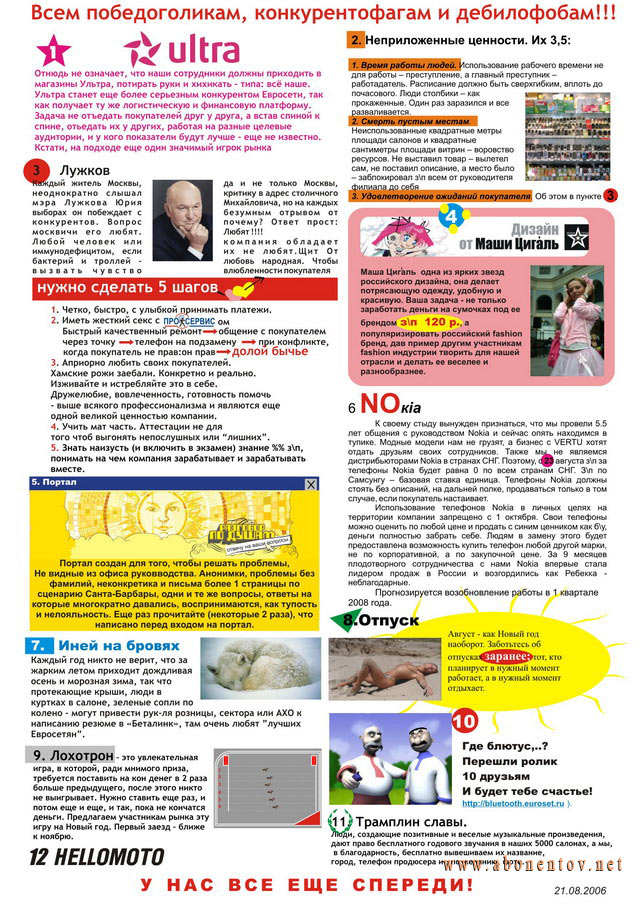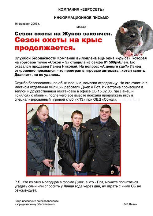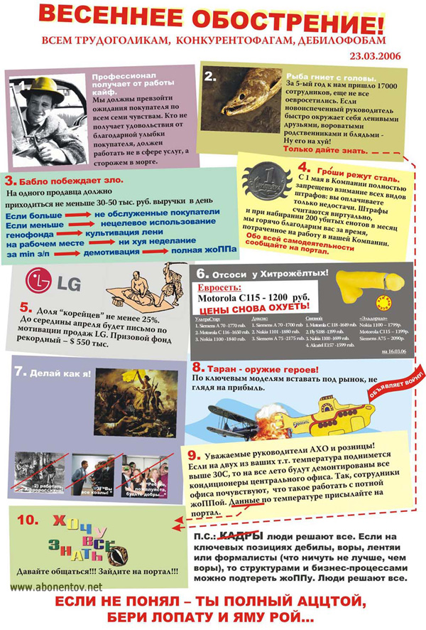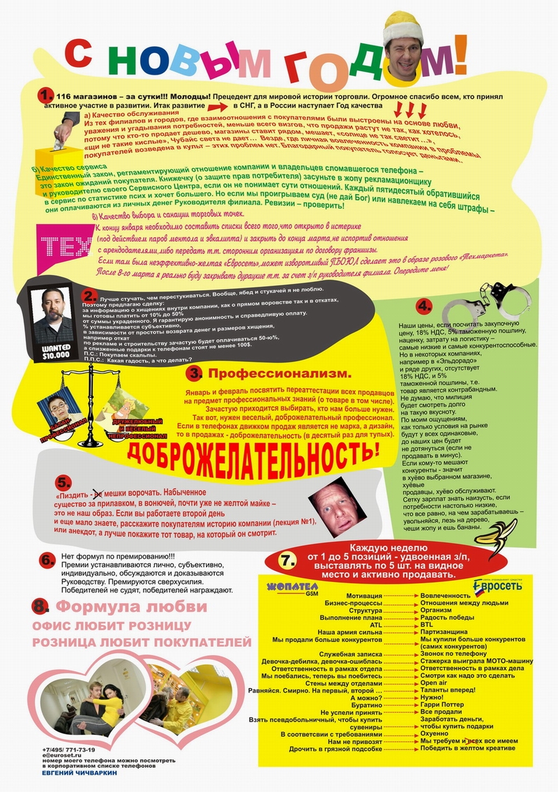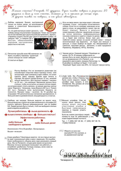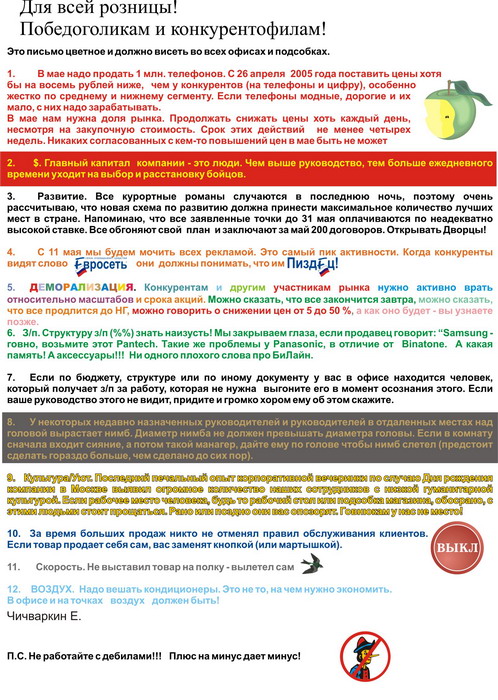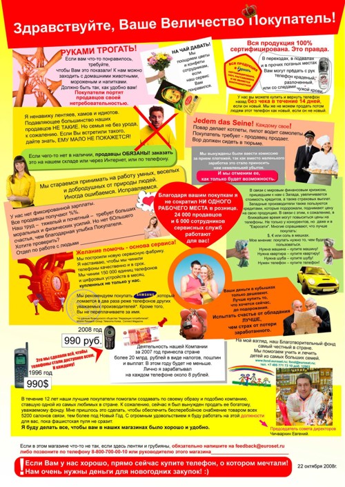 Похожий стиль Евгений Чичваркин решил использовать и в общении с покупателями. 22 октября во всех салонах «Евросети» будет распространяться «Письмо к покупателю». Максимально лаконичные и откровенные сообщения "на пальцах" объясняют политику компании во всех сферах ведения бизнеса. В письме бывший владелец «Евросети» уведомляет о смене своего статуса в компании. Как ранее сообщал Sostav.ru, Евгений Чичваркин продал свою долю и занимает пост председателя совета директоров. К потенциальным клиентам бывший совладелец компании обращается куда деликатнее, можно сказать, не без заискивания: «Здравствуйте, Ваше Величество Покупатель!». Ниже приводятся письма, адресованные сотрудникам. Как можно видеть, они использовались не только для поощрения, мотивации или поздравления сотрудников, но и для устрашения и наказания.