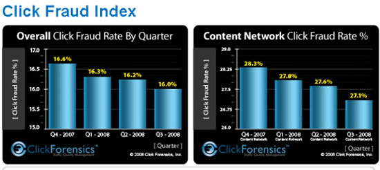 Полтора года спустя ситуация не улучшилась. Согласно данным свежего выпуска Click Fraud Index («Индекс фальшивых кликов») по состоянию на третий квартал 2008 года, мошенническими являются примерно 16,0% кликов. Это лишь немногим меньше, чем 16,2% мошеннических кликов, которые эксперты Click Forensics насчитали во втором квартале 2008 года.