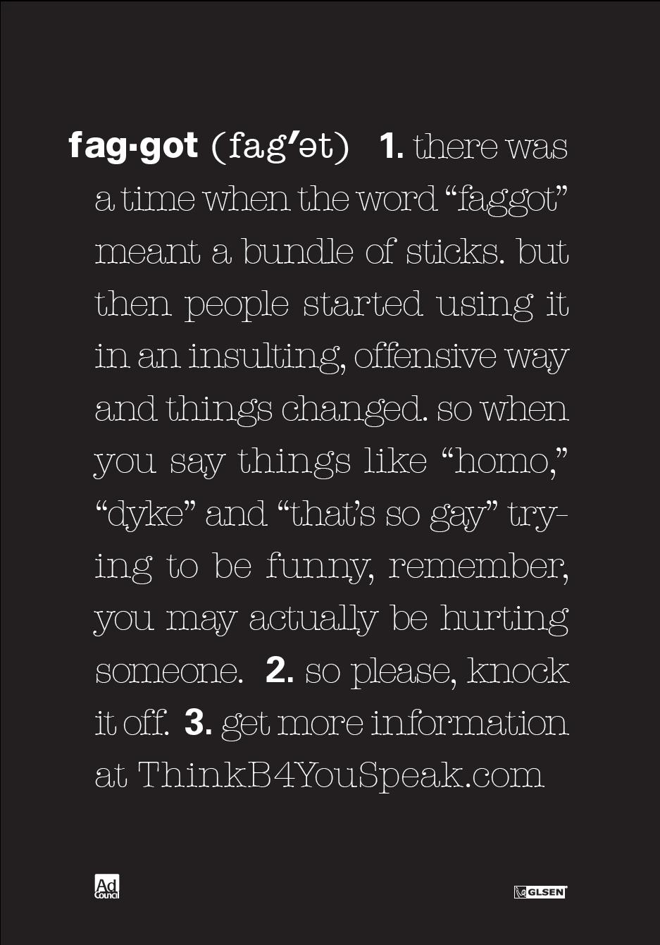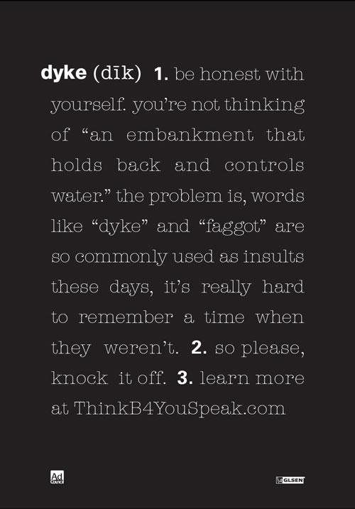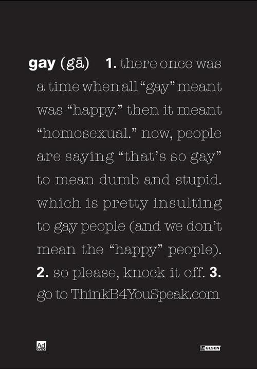 В США запрещено говорить "Это так по-гейски"Каждый день американские подростки оскорбляют сексменьшинства, используя в сленге слова "Gay" (гей), "faggot" (гомосексуалист) и "dyke" (леcбиянка) как синонимы глупости. Организация по защите прав геев и леcбиянок GLSEN запустила масштабную кампанию, чтобы рассказать молодежи о том, как сильно задевают эти слова представителей нетрадиционной ориентации. Большинство из них испытывают постоянный стресс, чувствуя негативное отношение общества, сообщило исследование GLSEN. Организация хочет остановить распространение "гомофобского" языка и создать благожелательную атмосферу для сексменьшинств в школах.Центральное внимание в спотах обращено на фразу "It's so gay" (Это так глупо), которую молодые люди произносят в разговоре, не задумываясь о ее значении. В рекламной кампании приняли участие такие знаменитости как Хилари Даф и Ванда Сайкс, которые объясняют ребятам, что надо более точно подбирать слова и быть толерантными. "Когда вы говорите, о! это так по-гейски, вы понимаете, что имеете в виду?", - звучит слоган кампании, приглашая на сайт www.thinkb4youspeak.com. Агентство: Arnold Worldwide NY Креативный директор: John Staffen Арт-директор: Gary Rozanski Копирайтер: Thom Baginski Продюсер: Pete Scudese, Sallie Moore Режиссер: Kevin Smith Продакшн: Backyard Productions, LA |