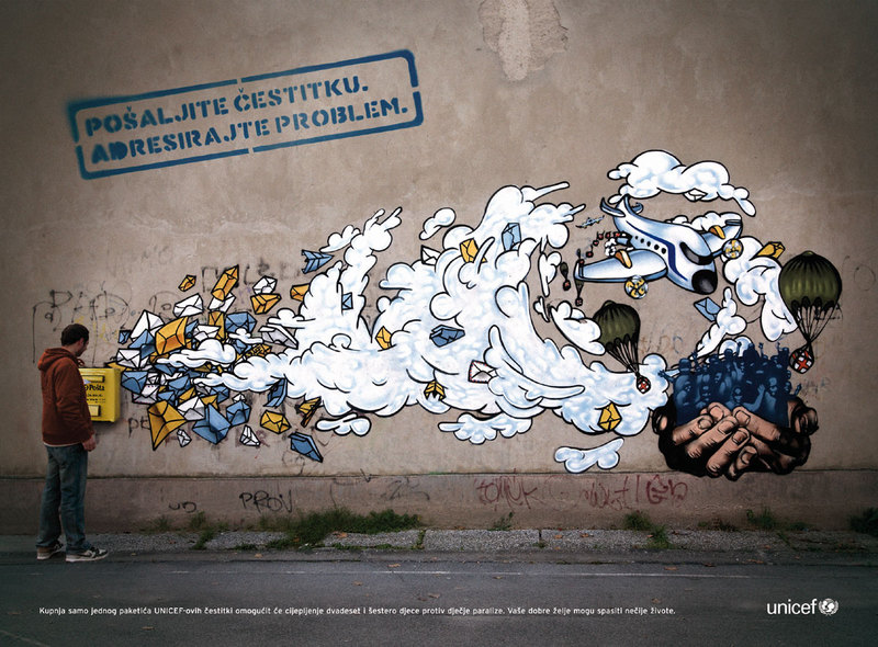 Рождественские открытки UNICEF спасут детскую жизньХорватское отделение международного чрезвычайного фонда помощи детям ООН ЮНИСЕФ (UNICEF) предлагает в преддверии Рождества рассылать открытки, которые помогут малоимущим детям получить квалифицированную медицинскую помощь и необходимую им вакцину от детского паралича.Принт рассказывает, что комплект рождественских открыток обеспечит 26 детей необходимой вакциной, а что может быть прекраснее, чем сделать доброе дело, способное спасти детскую жизнь, в канун Рождества. Примечательно, что для съемок этого плаката было создано настоящее граффити недалеко от Высшей Школы Коммерции (High school of Commerce) в Загребе (Хорватия). Теглайн: "Отправь открытку, реши проблему." |