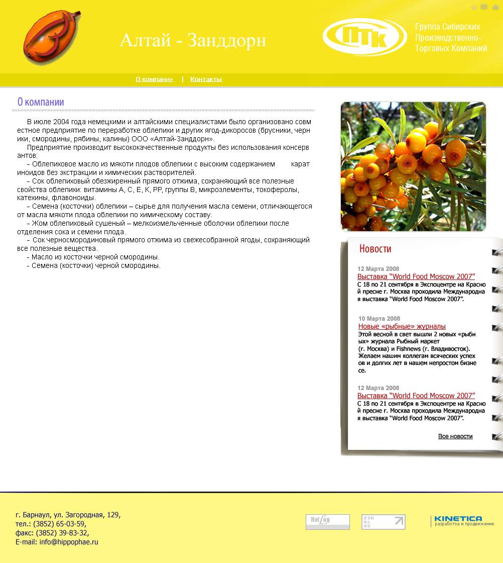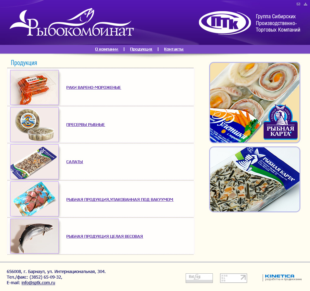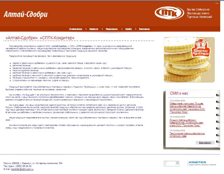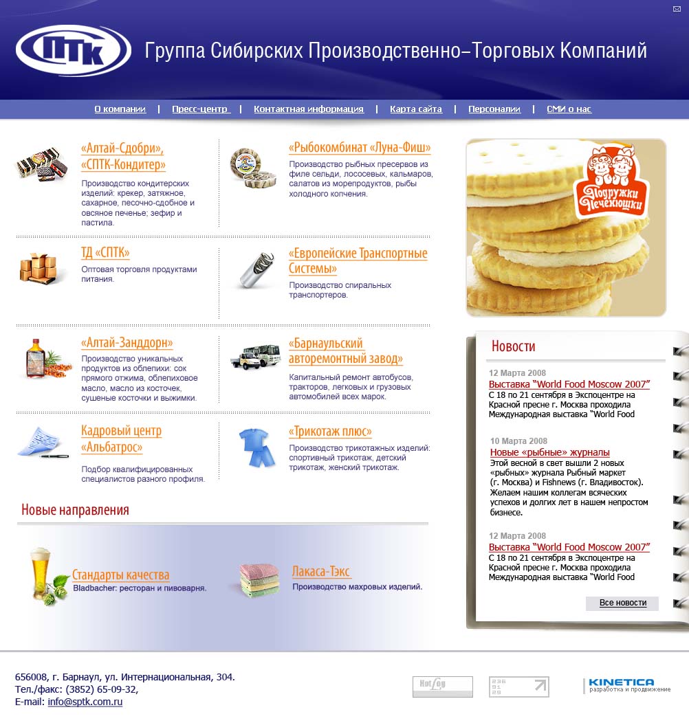 Рыба и не только«Сибирская Производственно-Торговая Компания» открыла корпоративный интернет-портал, объединяющий интересы десяти направлений своего бизнеса. Современный рынок диктует свои условия: планомерно падает стоимость доступа в Сеть, благодаря чему стремительно растет интернет-аудитория, входящая в сферу профессиональных интересов практически всех подразделений «СПТК». Исходя из новых реалий, руководством холдинга было принято решение о создании корпоративного портала, охватывающего все сферы деятельности Группы «СПТК». Интернет-агентство «Кинетика», имеющее опыт разработки веб-представительств крупных корпораций, было выбрано реализатором данного масштабного проекта. Новый корпоративный портал, запущенный по старому адресу http://sptk.com.ru/ представляет разветвленную структуру «СПТК», информируя о всех новостях и событиях, связанных с её деятельностью, происходящих внутри самой организации и за ее пределами. Строгий и минималистичный дизайн ресурса «разбавлен» тематическими анимированными и статичными баннерами. Каждый из основных подразделов выполнен в собственной цветовой гамме, но в единой сетке вёрстки корпоративного портала. Продвижение сайтов конкретных направлений входит в программу дальнейшей информационной поддержки веб-ресурса интернет-агентством «Кинетика». В частности, специально зарегистрированный домен www.altai-sdobri.ru будет вести на сайт «Алтай-Сдобри», расположенный в настоящий момент внутри структуры корпоративного портала. Такой подход позволит каждому из подразделений «СПТК» определенным образом позиционировать свой сайт для конкретной целевой аудитории, при этом сохраняя целостный образ холдинга. |