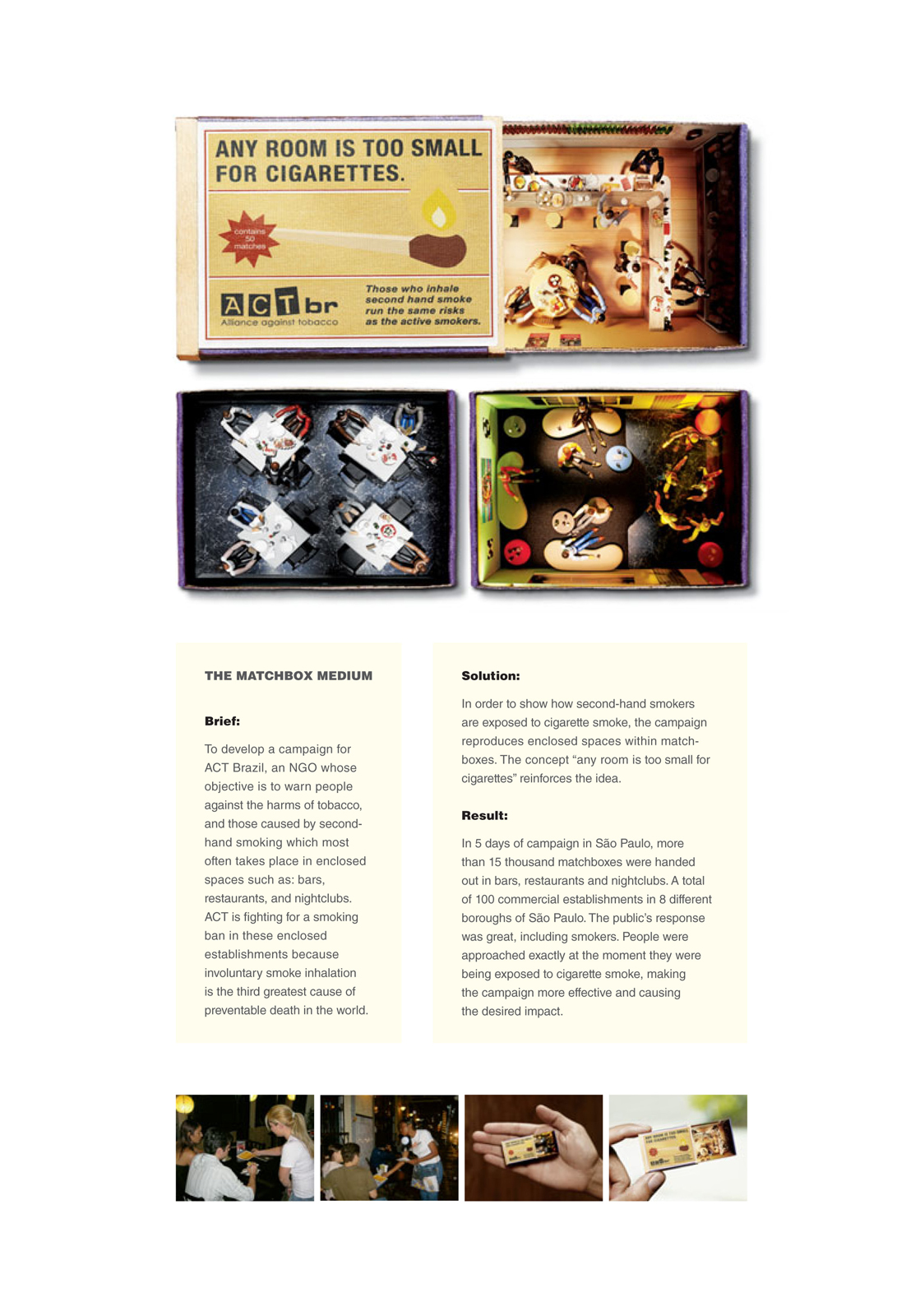 ACT: спички против пассивного куренияБразильское креативное агентство Neogama/BBH разработало оригинальную социальную кампанию для здравоохранительной организации ACT Brazil: официанты и бармены по просьбе посетителей давали им спичечные коробки, внутри у которых были не желанные спички, а изображения различных помещений. Посыл прост: «Любая комната очень мала для сигарет». Отметим, что в ходе этой кампании было реализовано около 15 000 коробков в различных публичных местах Сан-Паулу таких, как рестораны, бары и ночные клубы. Агентство Neogama/BBH уже не первый раз демонстрирует свое мастерство в сфере борьбы с курением, достаточно вспомнить несколько работ для организации ADESF: «курильщики изнутри» и «утешительные прогнозы». Агентство: Neogama/BBH, Сан-Паулу, Бразилия |