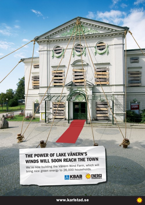Карлстад рекламирует ветряную фермуВ районе крупнейшего озера Швеции Венерн круглый год дуют сильные ветра, которые, по заверению креативного агентства Clara, могут поднять в воздух даже здания и памятники. Чтобы направить эту энергию в правильное русло, руководство шведского города-порта Карлстад приняло решение построить Ветряную Ферму Венерн, о чем и сообщает данная серия принтов, разработанная креативным агентством Clara.Заметим, что огромным достоинством ветряных генераторов является то, что они практически не потребляют ископаемого топлива, однако выработка электроэнергии зависит от силы ветра и поэтому отличается большим непостоянством. Теглайн: "Сила ветров озера Венерн скоро достигнет города. Сейчас мы строим Ветряную Ферму Венерн, которая принесет хорошую экологически чистую энергию 26 000 семей". Агентство: Clara, Карлстад, Швеция Арт-директор: Erik Nilsson Копирайтер: Rolf Harju Фотограф: Lipkin |