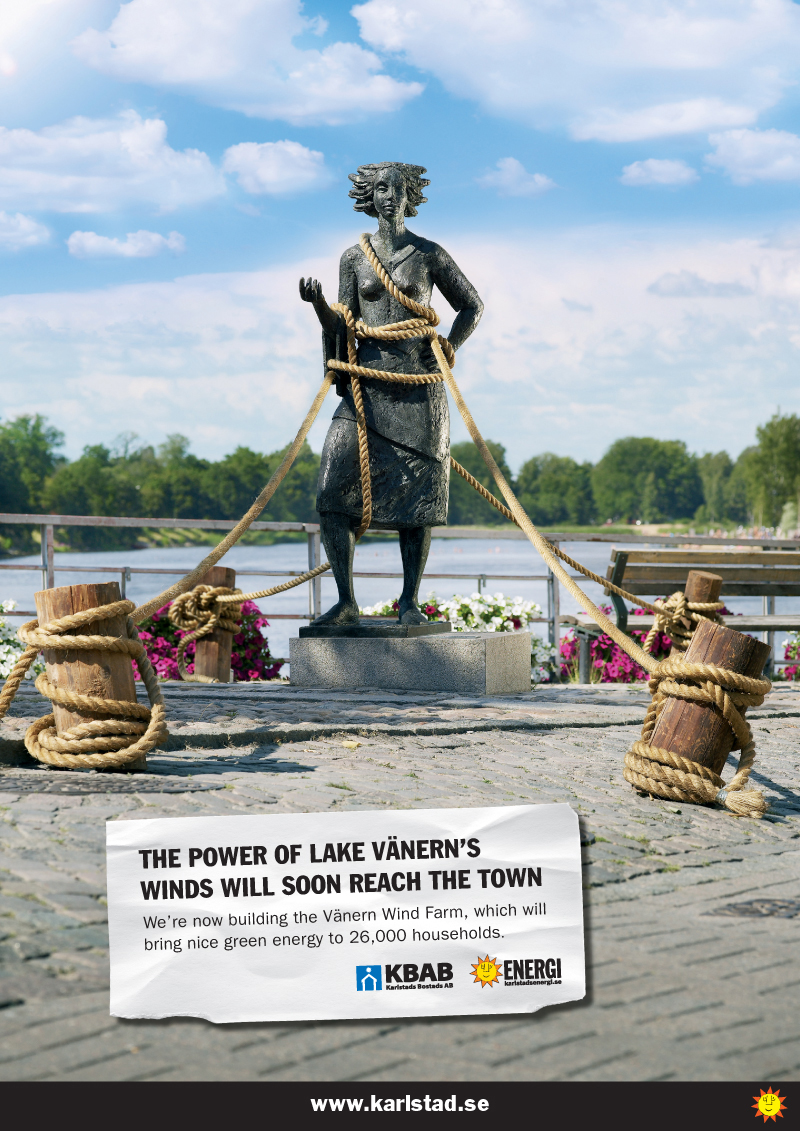 Карлстад рекламирует ветряную фермуВ районе крупнейшего озера Швеции Венерн круглый год дуют сильные ветра, которые, по заверению креативного агентства Clara, могут поднять в воздух даже здания и памятники. Чтобы направить эту энергию в правильное русло, руководство шведского города-порта Карлстад приняло решение построить Ветряную Ферму Венерн, о чем и сообщает данная серия принтов, разработанная креативным агентством Clara.Заметим, что огромным достоинством ветряных генераторов является то, что они практически не потребляют ископаемого топлива, однако выработка электроэнергии зависит от силы ветра и поэтому отличается большим непостоянством. Теглайн: "Сила ветров озера Венерн скоро достигнет города. Сейчас мы строим Ветряную Ферму Венерн, которая принесет хорошую экологически чистую энергию 26 000 семей". Агентство: Clara, Карлстад, Швеция Арт-директор: Erik Nilsson Копирайтер: Rolf Harju Фотограф: Lipkin |