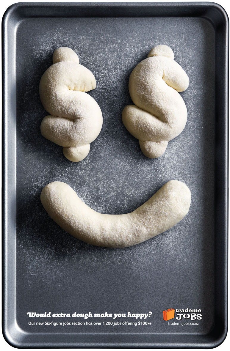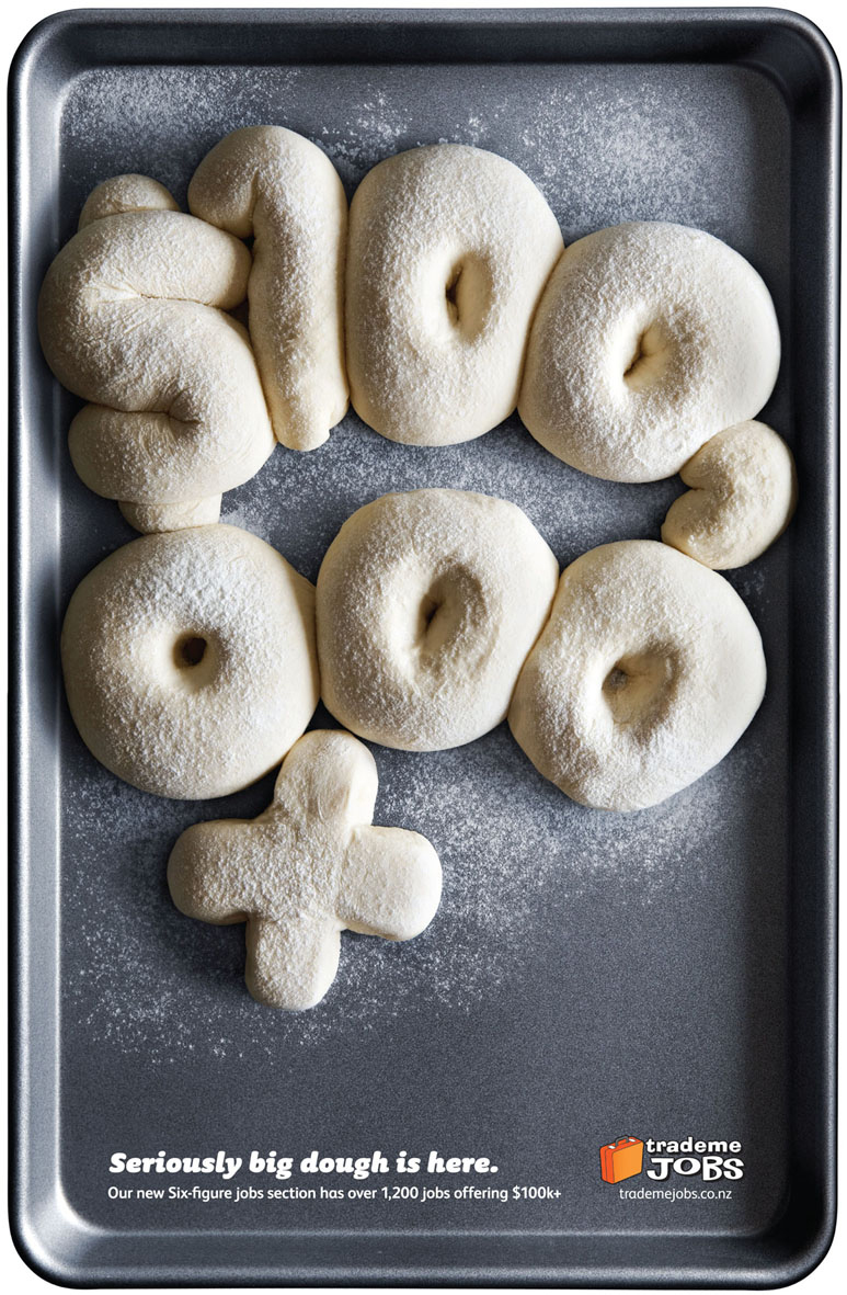 Рекрутинговая компания Trade Me Jobs рекламируется с помощью выпечкиАнглийское слово "dough" имеет несколько значений. В обычном понимании - это просто тесто, а на сленге "dough" означает деньги. На этом новозеландское креативное агентство Y&R и решило построить данную рекламную кампанию для рекрутингого портала Trade Me Jobs. Все дело в том, что на сайте www.trademe.co.nz появился новый раздел Six-figure jobs, в котором публикуются предложения от работодателей с шестизначной заработной платой.Теглайн: "Здесь реально большие деньги. Сделают ли тебя счастливее дополнительные деньги? В нашей новой секции Six-figure jobs имеется более 1 200 предложений на зарплату более $100k". Агентство: Y&R, Веллингтон, Новая Зеландия Творческий директор: Chrissie Lahood Арт-директор: Anton Hart Копирайтер: Claire Stapleton Фотограф: Hamish Trounson |