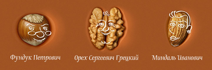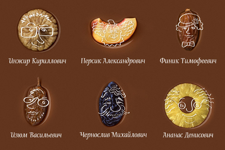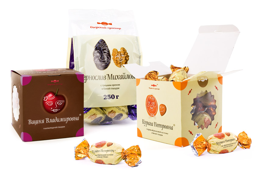 Артемий Лебедев с конфетками на выСтудия Артемия Лебедева очень переживает за судьбу сладостей Кондитерского комбината "Озерский сувенир". Для того, чтобы множество разновидностей индивидуально завернутых сухофруктов и орехов в шоколадной глазури не затерялись среди аналогичных конфет производства других фабрик, чтобы покупатель мог узнать их в лицо и по имени, сотрудники Студии придумали для каждого сорта свое лицо, а также имя-отчество, благодаря чему покупатель теперь может попросить у продавца не безымянную конфету, а Вишню Владимировну или Кумквата Карловича. Сухофрукты в белом шоколаде будут упакованы в фантики молочно-желтого цвета, конфеты в темном шоколаде - в коричневые. Это сделает навигацию максимально удобной для сластен. Развесные сорта будут продаваться пакетах и коробочках от дизайнеров Студии. Специально для этого проекта был создан новый шрифт "Кендисвит", которым выполнены все названия конфет и заголовки. Работа выполнена по заказу компании "Роялти энд проперти менеджмент истеблишмент кампании".