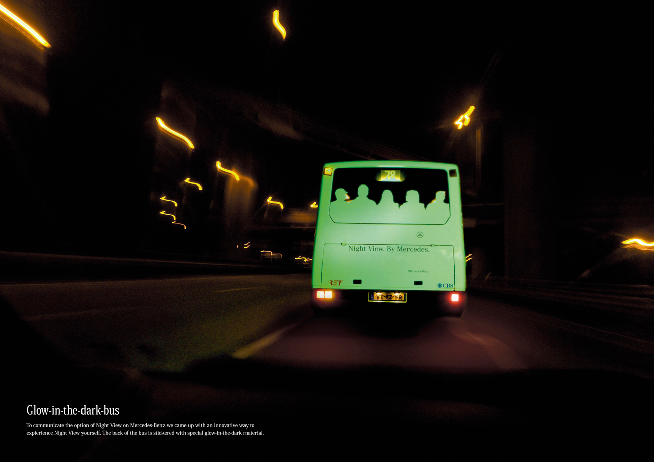 Mercedes-Benz заставил автобус светиться в темнотеАвтомобильная компания Mercedes уже давно использует свою технологию Night View, а нидерландское агентство FHV BBDO в очередной раз помогает эту концерну с созданием рекламных кампаний.Сегодня речь идет о непревзойденной системе Night View Assist, которая позволяет водителю намного лучше видеть дорогу в ночное время суток: в фары встраиваются специальные инфракрасные излучатели, а за стеклом располагается специальная камера, которая работает в этом диапазоне. Таким образом, водитель получает возможность видеть на мониторе черно-белое изображение того, что находится перед машиной, причем на много дальше, чем могут осветить фары. Теглайн: "Night View (Ночное видение). От Mercedes." Агентство: FHV BBDO, Амстердам, Нидерланды Творческий директор: Mark Muller, Bart Bus Арт-директор: Yona H?mmels Копирайтер: Stef Jongenelen Эккаунт-менеджер: Bas Verdoorn |