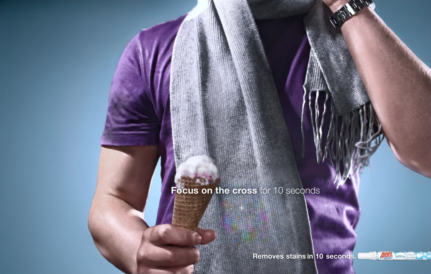Карманный Ariel быстрого действияДля тех, чей образ жизни достаточно активен и коварные пятна подстерегают на каждом шагу, выпускается карманная версия Ariel. С ее помощью вы сможете удалить пятно с одежды за 10 секунд.Удаляет пятна за 10 секунд Школа рекламы: Fakd & European school of Design, Frankfurt, Germany Креативные директора: Ralph Thamm, Mathias Gregorzek Арт директор: Danilo Dick Farah |
