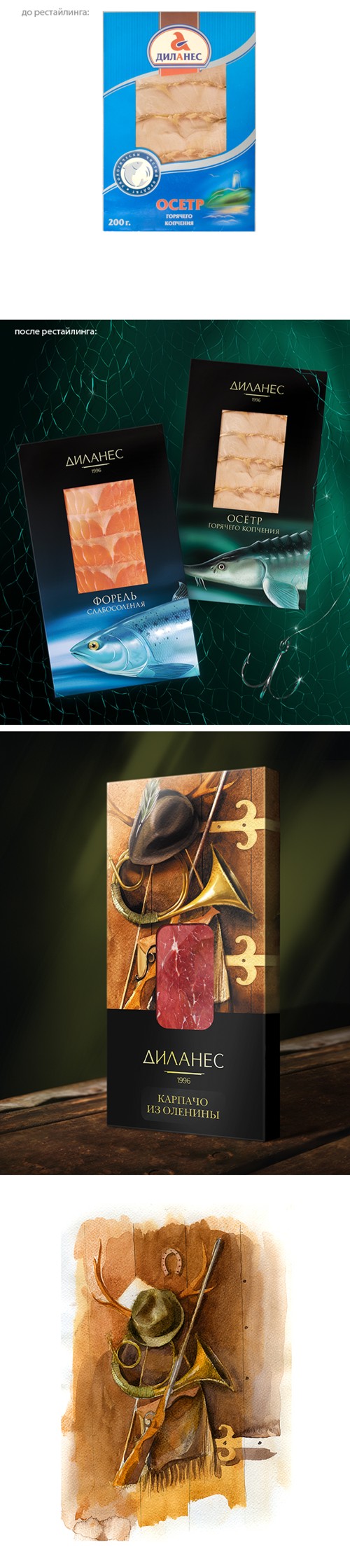 Шляпа, ружье и "Диланес""Диланес" - холдинг, ориентированный на производство деликатесов. Основными производственными направлениями компании являются мясная гастрономия и рыбные деликатесы, представленные в большинстве крупных розничных сетей, включая такие, как "Азбука вкуса" и "Седьмой континент".Специалисты брендинговой компании "Остров Свободы" провели рестайлинг основных элементов фирменного стиля и разработали новый дизайн упаковки продукции рыбных и мясных деликатесов. Главной особенностью проекта стал авторский иллюстративный подход, используемый для создания концепций упаковок для двух приоритетных видов продукции. |