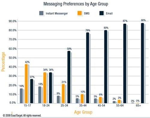 По данным авторов исследования, выдержки из которого приводит Marketing Charts, это объясняется тем, что молодежь воспринимает социальные сети в первую очередь как место общения с друзьями, а не с маркетологами. Так что маркетологам на стоит обольщаться: если люди привыкли общаться друг с другом посредством какого-то инструмента, то это не значит, что этот же инструмент нужно использовать для рекламы им какого-то продукта. В целом, если говорить о коммуникационных предпочтениях опрошенных, то окажется, что с друзьями и семьей они предпочитают общаться именно по телефону, а не при помощи электронной почты, и эта зависимость прямо связана с возрастом. Среди опрошенных старше 65 лет лишь 8% используют SMS-сообщения и лишь 4% пользуются социальными сетями. В то же время среди подростков SMS используют для общения 42% опрошенных.