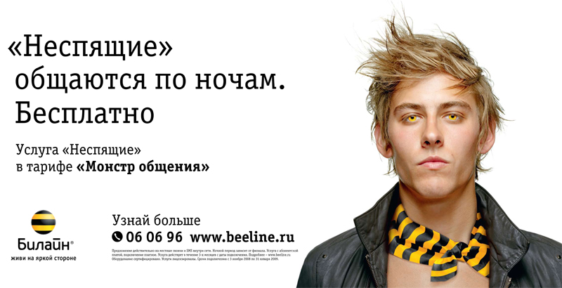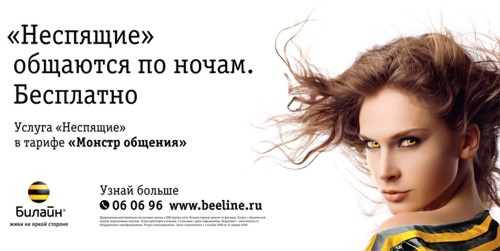 Beeline сверкнул глазами в ночи«ВымпелКом» запустил рекламную кампанию, продвигающую новую услугу "Неспящие" в тарифе "Монстр общения". Чтобы показать преимущества своего нового предложения, BBDO Moscow изобразило людей, ведущих ночной образ жизни, с желтыми глазами. Это странное зрелище не дает абстрагироваться от мыслей о обитателях преисподней и песни группы "Конец Фильма", в которой поется о том, что "У нее желтые глаза...". В качестве каналов продвижения были задействованы телевидение, радио, пресса, Интернет и наружная реклама. Кампания стартовала 3 ноября.