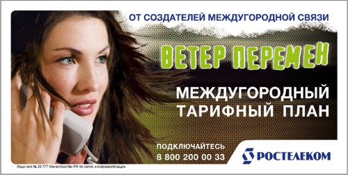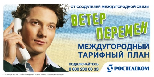 MOVIE почувствовало ветер переменВ сентябре 2008 года РА MOVIE выиграло закрытый тендер на разработку креативной концепции, продвигающей инновационное для сегмента фиксированной связи предложение ОАО "Ростелеком" междугородный тарифный план.Агентство разработало для тарифного плана название "Ветер Перемен", а также материалы с одноименным названием для рекламной кампании, которая продлится до конца декабря 2008 года. Для кампании был снят ТВ ролик, разработаны макеты для ООН 6*3, прессы, метро, стикеры для лифтов и аудиоролик. Название тарифного плана "Ветер Перемен" символично и акцентирует позитивные изменения, которые компания Ростелеком обеспечивает своим абонентам появлением нового продукта. Ветер перемен меняет хорошее к лучшему! В коммуникации утрирован тот факт, что цифры теперь не так важны - тарифный план "Ветер перемен" попросту "уносит" цифры, которые мешают полноценно общаться по междугородному телефону. Он сокращает расстояния, позволяет не смотреть на часы, считая минуты разговора, сближает влюбленных, дарит больше времени для дружеского общения! "Ветер перемен" от Ростелекома оставляет в нашей жизни ГЛАВНОЕ - человеческое общение. Состав творческой группы: ОАО "Ростелеком" Директор департамента продуктов и маркетинга: Родион Левочка Начальник отдела маркетинговых коммуникаций: Анжелика Соловьева Начальник службы рекламы: Ирина Мариани Главный специалист службы рекламы: Ксения Фокина. Ведущий специалист службы рекламы: Ирина Сорокина РА MOVIE Креативный директор: Наталья Мусина Арт-директора: Кирилл Осипов Копирайтер: Яна Ванинская Дизайнеры: Руслан Пронин, Родион Фуриков Директор отдела по работе с клиентами: Анна Волина Директор группы по работе с клиентами: Елена Голубева Менеджер по работе с клиентами: Елена Платонова Директор по стратегическому планированию: Юлия Строкова Менеджер по стратегическому планированию: Илья Плакхинас Production House "Park Production" Режиссер Charles Barker Оператор Павел Капинос Продюсер Михаил Гершфельд |