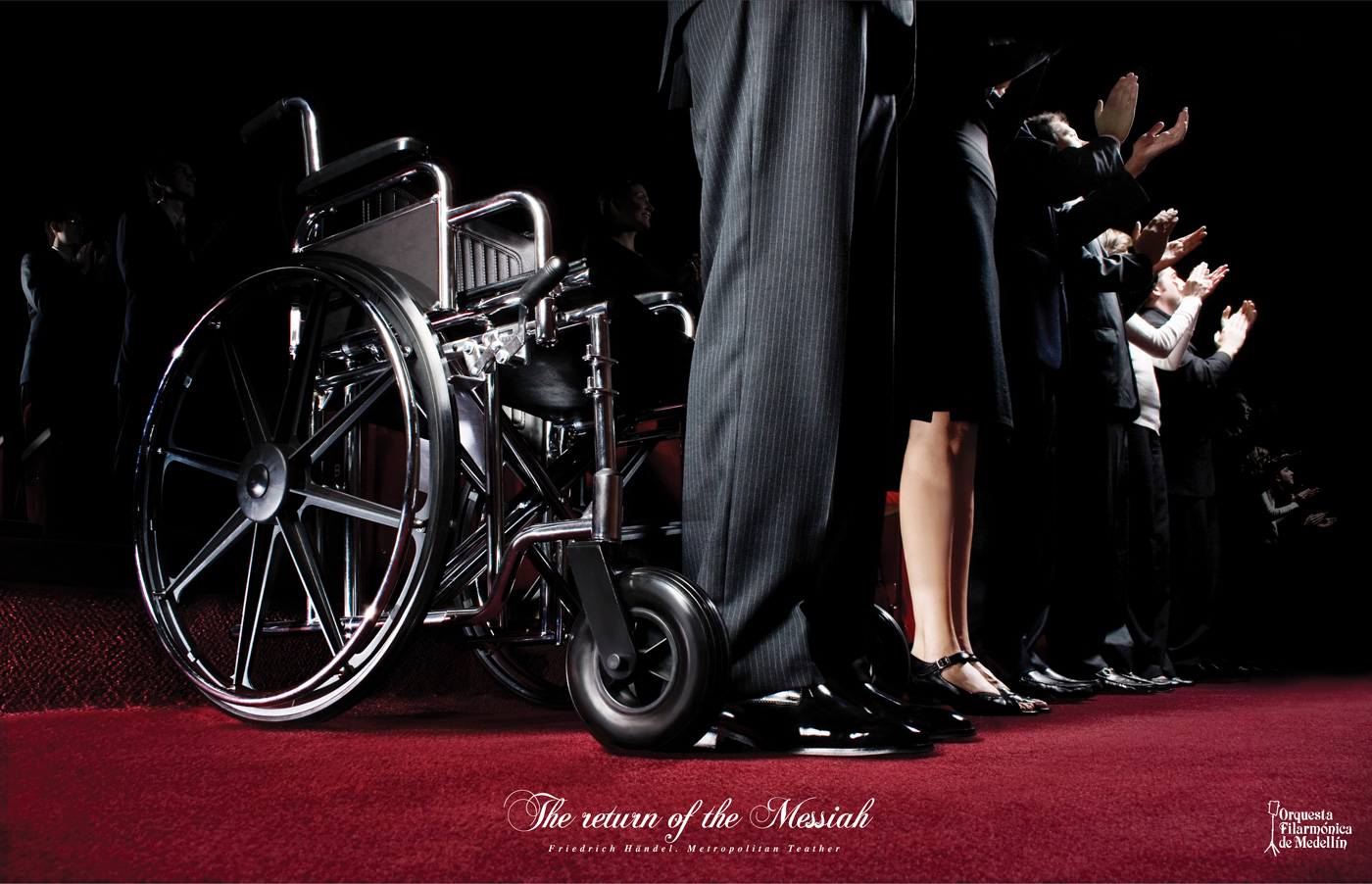 Orquesta Filarmonica de Medellin поднимает инвалидов на ногиПоднять инвалида на ноги могут не только дорогие лекарства и постоянные упражнения, но и чудесная музыка, рассказывает колумбийское рекламное агентство Gomez Chica/EURO RSCG. Это не просто слова, а тем, кто в это не верит, креаторы предлагают посетить концерт филармонического оркестра Orquesta Filarm?nica de Medell?n, в финале которого просто не возможно удержаться от оваций.Теглайн: "Возвращение Мессии." Агентство: Gomez Chica/EURO RSCG, Медельин, Колумбия Творческий директор / Копирайтер: Juan Sebastian Jaramillo Арт-директор: Camilo Diaz Фотограф: Augusto Cartagena |