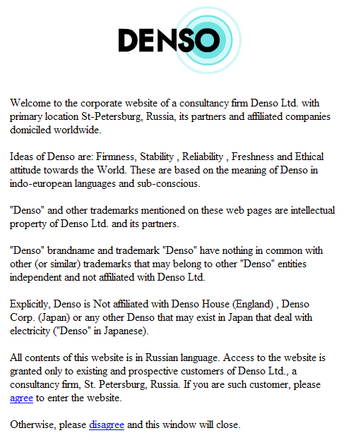 Denso Corporation, владеющая товарным знаком denso для маркировки электрооборудования (зарегистрирован более чем в ста странах мира, включая Россию), несколько лет пыталась отстоять свое право на сайт denso.com. Весной 2000 г. Denso забыли продлить его регистрацию, и имя было перехвачено некой американской компанией Denso Domain, в том же году переуступившей его российской "Денсо". Годом позже "Денсо" договором простого товарищества передала права на использование этого домена компании "Сервиспойнт", оставшись его администратором.
