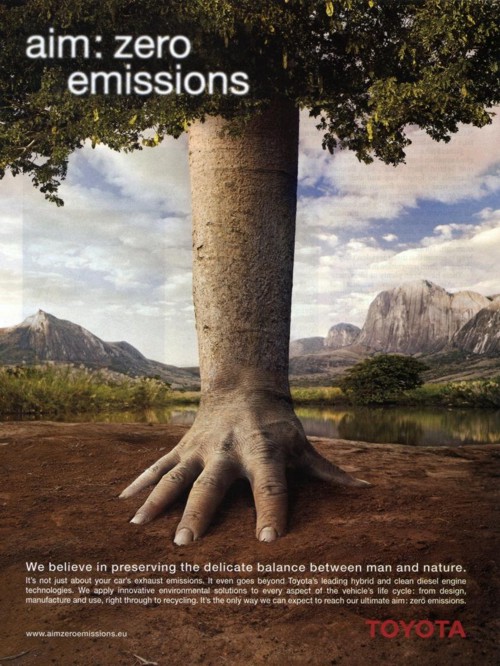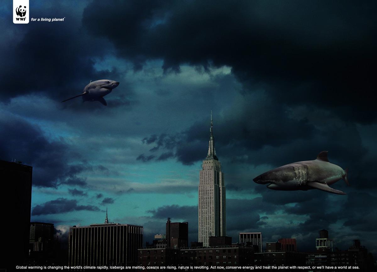 Между тем, в рекламе коммерческие компании используют тот же визуальный язык, что и «зеленые» организации, запутывая потребителя. Как результат, аудитория неоднозначно воспринимает экологические символы. К примеру, реклама окон Spi использует абсолютно те же образы, что и WWF, предупреждающий об опасности глобального изменения климата: на обоих принтах изображен затопленный город, мимо зданий которого проплывают акулы. Бренд Diesel в свою очередь также легкомысленно подходит к серьезной теме глобальных катаклизмов, играя на страхе людей, отмечает Пол Фостер.