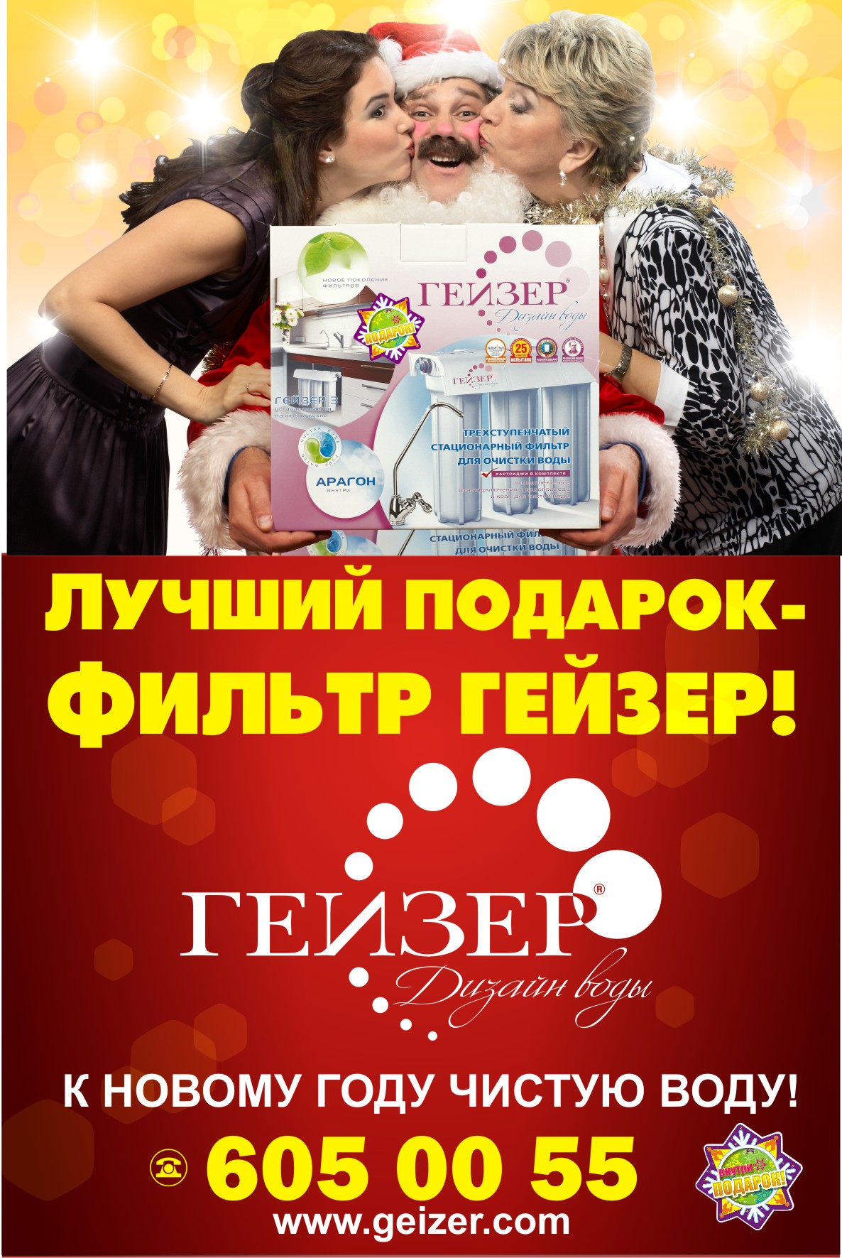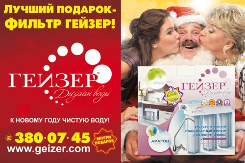 В Новый год тоже надо пить вкусноПредновогодняя кампания Гейзер стартовала в Московском и С-Петербургском метро."В этом году мы решили напомнить, что начинать новый год надо не только с чистой совестью, но и с чистой водой. К тому же в каждой коробке фильтра обещан полезный подарок, который сразу покажет вкусовые преимущества чистой воды. Популярная тема кризиса оставлена нами без внимания, так как в любой кризис чистая вода такая же необходимость, как хлеб и деньги", - рассказали Sostav.ru в компании. Напомним, последняя рекламная кампания бренда "Гейзер" "Можно пить вкусно" состояла из трех последовательно размещенных в наружке макетов и прошла в российских городах-миллионниках. |