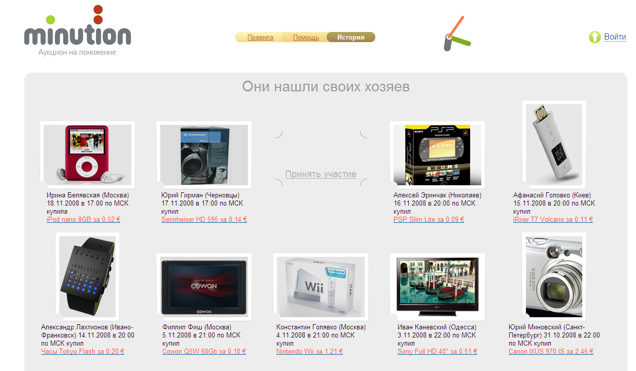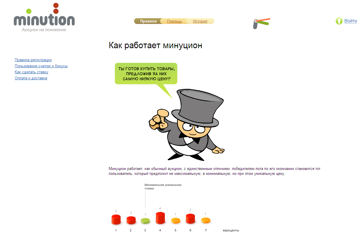 Мinution.com для жадныхСтудия Артемия Лебедева разработала сайт необычного аукциона на понижениеСтудия Артемия Лебедева разработала дизайн сайта minution.com. Этот интернет-аукцион интересен, прежде всего, своим необычным форматом - торговля на нем идет не на повышение, а на понижение. Регистрация бесплатна и если пользователь укажет свой номер мобильного телефона, то получит бонус в размере 2 евро и получит возможность поставить на ряд лотов. Правила торговли достаточно просты и их вполне доходчиво объясняет анимированный человечек в цилиндре из раздела "Правила". В итоге право купить лот получает тот пользователь, который предложит не максимальную, а минимальную цену, которую никто из его конкурентов не продублирует за время торгов. Ставки делятся на три вида: уникальная ставка (на нее поставил только один участник в аукционе), неуникальная ставка (одинаковая ставка была сделана рядом пользователей) и уникальная минимальная ставка (самая маленькая цена, названная только одним пользователем). Последняя и определяет победителя. На протяжении торгов, которые могут длиться до нескольких месяцев, статус ставки может не единожды меняться. Наверняка в борьбе за автомобиль Mazda 3 MPS, начальная стоимость которого составляет 26 тысяч евро, заявка будет стоить 4 евро. На сайте указано, что ставка это зарегистрированное на minution.com предложение пользователя об обмене указанной в каждом отдельно взятом лоте цены заявки на пакет Информации по этому лоту. При этом с личного счета снимается соответствующая сумма. Ставки можно делать как на определенную сумму, так и на диапазон цен. Чтобы иметь возможность торговать, пользователь должен иметь положительный баланс не менее 10 евро на своем персональном счете, пополнять который можно при помощи пластиковых карт, электронных платежных систем, SMS и др. Новых пользователей minution поощряет не только 2 евро при регистрации, но и удвоением первого депозита. За вовлечение новых аукционеров тоже платят - по 4 евро за человека. Согласно пользовательскому соглашению, на электронный адрес, указанный пользователем при регистрации, могут приходить рекламные сообщения о партнерах Minution. На сайте есть раздел "Они нашли своих хозяев", в котором показаны победители десяти предыдущих аукционов. Состав творческой группы: Студия Артемия Лебедева Арт-директор Рома Воронежский Дизайнеры Павел Радюк, Олег Коротаев Технический дизайнер Татьяна Ляшенко Флеш-технолог Олег Пшеничный Технический директор Сергей Чикуенок Технологи Олег Подчашинский, Мария Мусаковская Редактор Александр Носиков Менеджеры Ольга Евтушенко, Дарья Свиридова Евгения Мелешко, Sostav.ru |
