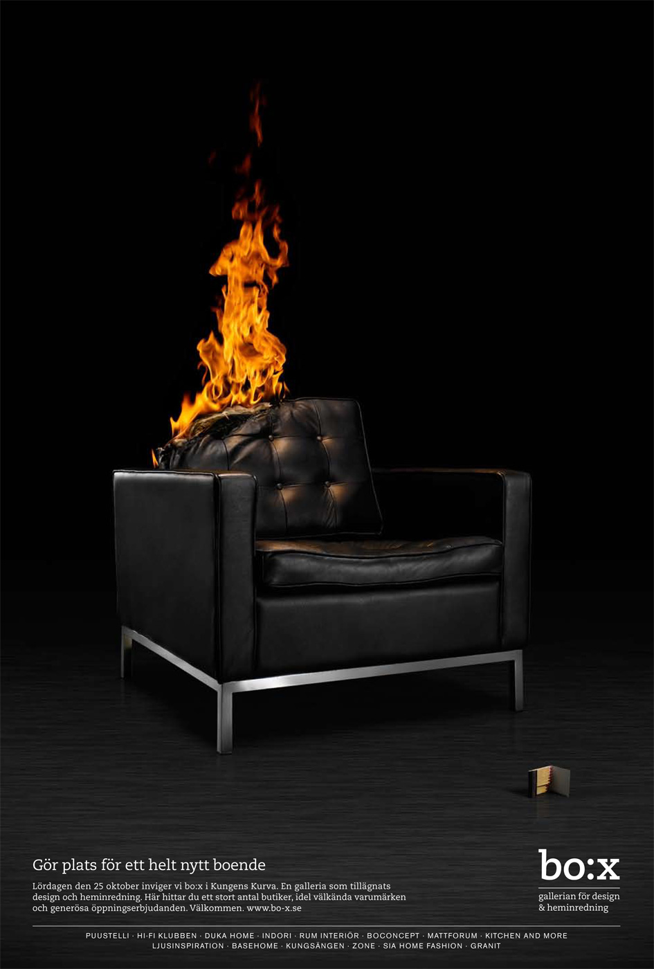 Магазин bo:x предлагает уничтожить свой старый интерьерТорговая сеть bo:x специализируется на товарах, которые просто необходимы любому жилому дому. В огромных магазинах этой сети люди не найдут одежду, продукты питания, обувь или украшения, которые можно купить в любом торговом центре… Здесь перед ними откроется настоящий мир интерьера. А чтобы дома было место, где разместить покупки, агентство John Doe Worldwide предлагает уничтожить старые атрибуты интерьера своей квартиры.Теглайн: "Освободи немного места и переделай свой дом. bo:x - торговый центр, специализирующийся на внутреннем дизайне." Агентство: John Doe Worldwide, Стокгольм, Швеция Творческий директор: Fredrik Blomberg Арт-директор: Emil Jonsson Копирайтер: Christoffer Lundstrim Фотограф: Bohman & Sj?strand |