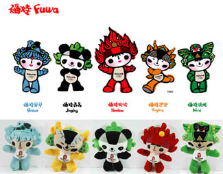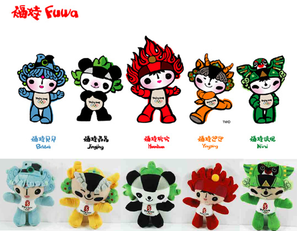 Игры XXIX Олимпиады 2008, Пекин: Фува (дети счастья) — рыба Бейбей, панда Дзиньдзинь, тибетская антилопа Иньинь, ласточка Нини и олимпийский огонек Хуаньхуань.
