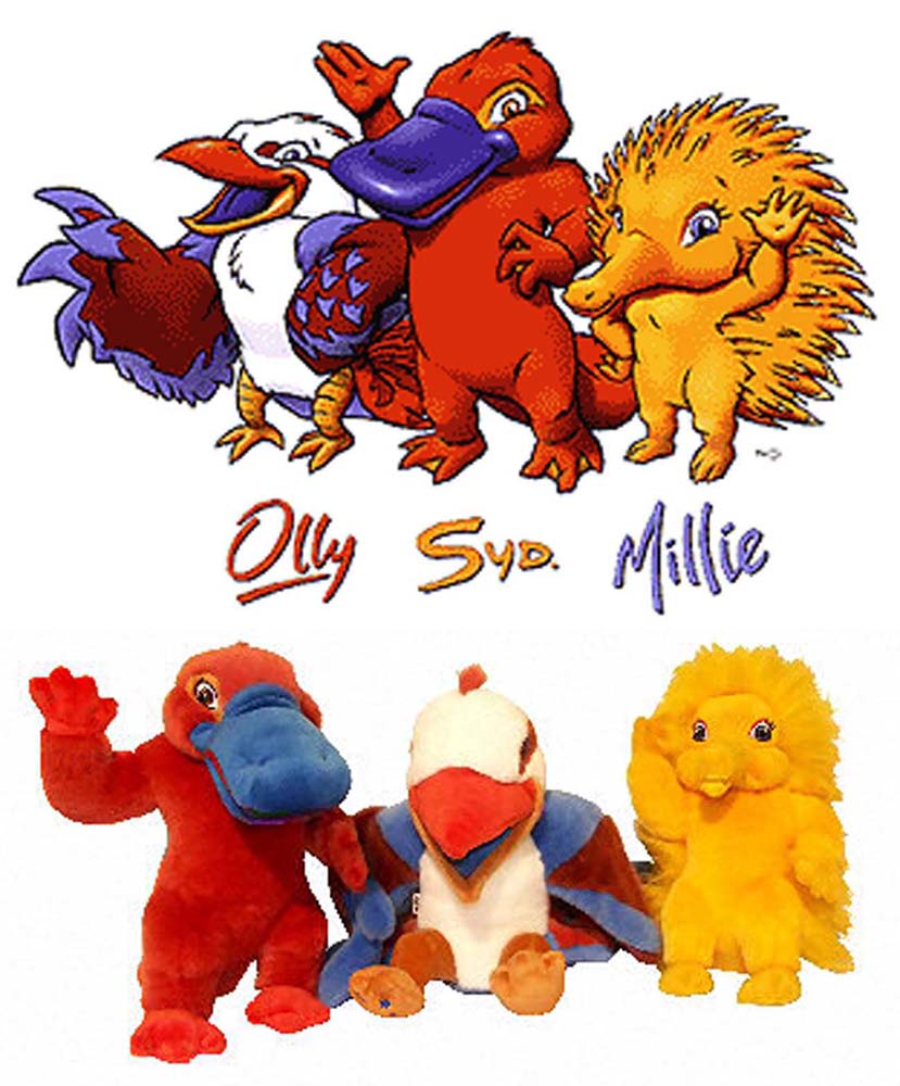 Игры XXVII Олимпиады 2000, Сидней: кукабарра Олли, утконос Сид, ехидна Милли. Эти австралийские животные символизируют землю, воздух и воду. Олли является воплощением Олимпийского духа великодушия и щедрости (Олли — производное от слова Олимпийский). Сид символизирует окружающую среду и отражает силу и энергию Австралии и ее населения (имя Сид – производное от Сидней). Милли это нечто выдающееся, своего рода информационный гуру, в руках которого сосредоточены все факты и цифры (Милли – производное от слова миллениум).