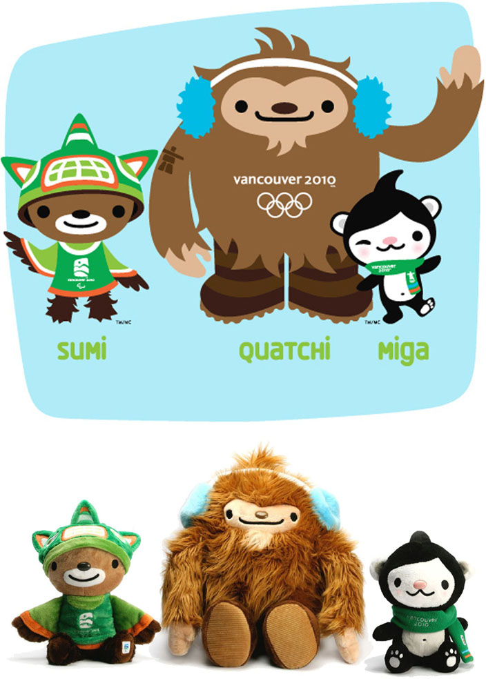 XXI зимние Олимпийские игры 2010, Ванкувер: морской медвежонок Мига (странное существо — частью касатка, частью белый медведь кермод), снежный человек Куатчи (талисманы олимпийских игр), мифологический персонаж Суми (талисман паролимпийских игр). Мига — молодая морская медведица, которая живет в океане со своим семейством, близ Острова Ванкувер, неподалеку от Тофино, Британской Колумбии. Морские медведи это частью касатки, частью медведи. Морской медведь возник под влиянием индейских и эскимосских легенд о том, что касатки выходят на землю и превращаются в белых медведей кермодов. Куатчи — молодой снежный человек, который прибыл из таинственных канадских лесов. Куатчи застенчив, но любит исследовать новые места и встречать новых друзей. Куатчи любит все зимние спортивные состязания, но особенно он любит хоккей. Он мечтает стать знаменитым хоккеистом. Суми — дух, живущий в горах Британской Колумбии. Подобно многим Канадцам, у Суми сложная родословная. Он носит шляпу касатки, летит на крыльях могущественной гром-птицы и бежит на сильных пушистых ногах черного медведя.