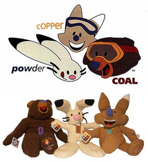 XIX зимние Олимпийские игры 2002, Солт-Лейк-Сити: заяц Поудер, койот Копер и медведь Коул. (порох, медь и уголь — некогда основные статьи дохода города). Эти персонажи символизируют Олимпийский девиз «Citius, Altius Fortius» (Быстрее, выше, сильнее). «Белый» заяц (быстрее): Однажды, по легенде, солнце очень сильно палило и тем самым иссушало землю. Заяц быстро взобрался на вершину горы и пустил стрелу в солнце. Оно ушло за облака, а на землю опустилась прохлада. «Медный» койот (выше): Когда на земле стало темно и холодно, койот взобрался на вершину самой высокой горы и украл огонь у Богов. И снова на земле стало тепло. «Угольно-черный» Американский медведь (сильнее): давным-давно храбрые охотники покинули свои деревни и ушли охотиться на медведя. Но медведь оказался слишком могущественным и вырвался из рук охотников. В настоящее время сыновья тех мужественных охотников продолжают погоню за медведем в ночном небе.