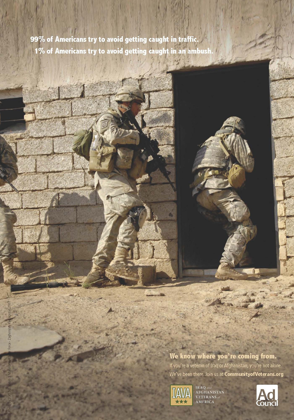 IAVA и BBDO помогают ветеранам военных действий в Ираке и АфганистанеОрганизация IAVA - единственная некоммерческая, стоящая вне политики организация, специализирующаяся на помощи и защите интересов ветеранов боевых действий в Ираке и Афганистане. Рекламная кампания от американского BBDO, информирует ветеранов о том, что они больше не одни и призывает посетить интернет-портал CommunityofVeterans.org.99% американцев надеются, что счётчик платы за парковку не покажет ноль 1% американцев надеются, что удача не сойдет к нулю 99% американцев пытаются не попасть в пробку 1% американцев пытается не попасть в засаду 99% американцев видели боевые действия по телевизору 1% американцев видел боевые действия вживую Агентство: BBDO New York, USA Креативный директор: Don Schneider Арт директор: John Leu Копирайтер: Brad Roseberry Фотографы: Petty Officer 2nd class Sandra M. Palumbo; Tech. Sgt. Jeremy T. Lock; Staff Sgt. JoAnn S. Makinano |