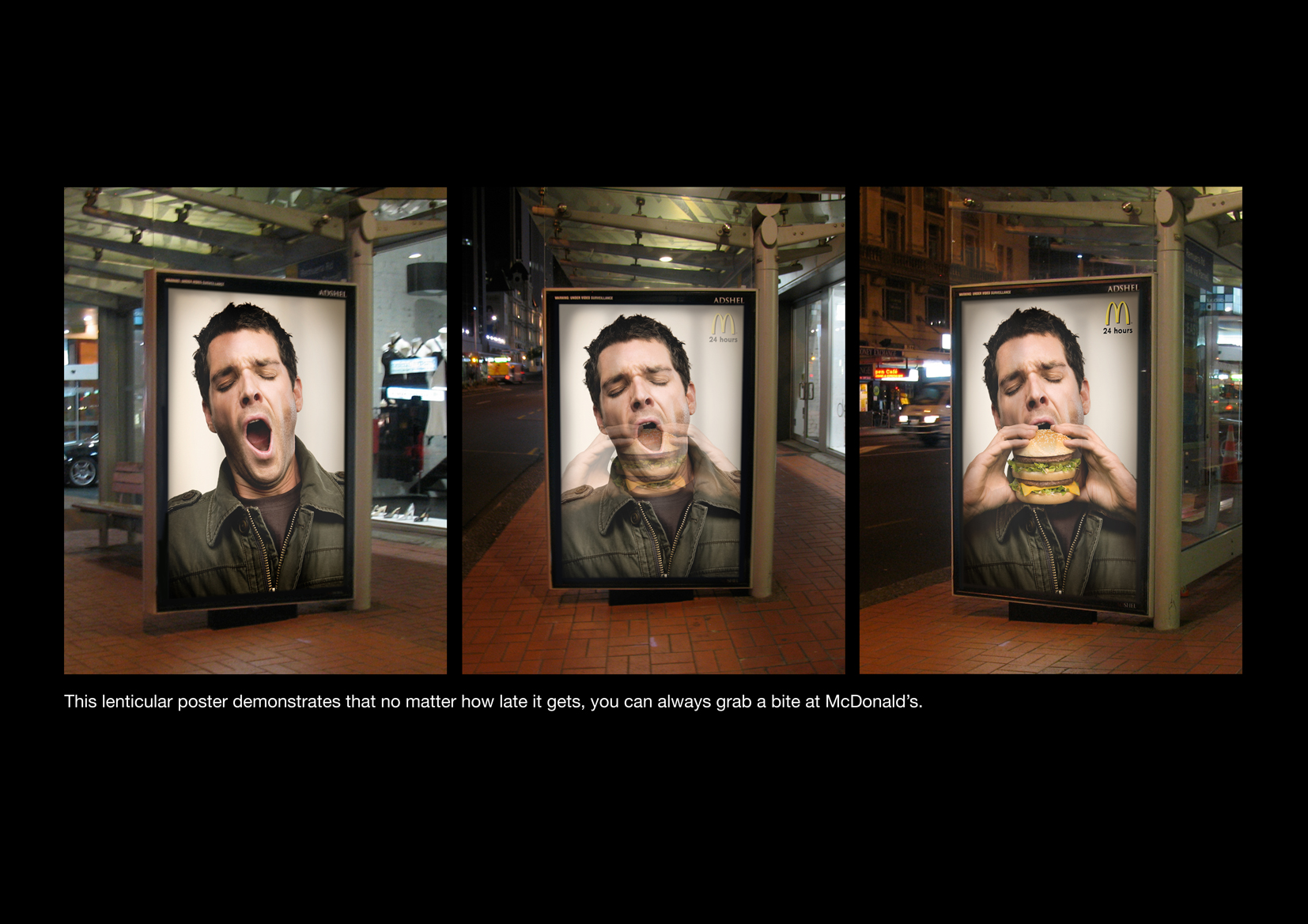 Оптическая реклама от McDonald'sЭтот новый постер с оптическим эффектом - дело рук креаторов из новозеландского представительства рекламного агентства DDB. В зависимости от угла зрения прохожий видит либо зевающего во весь рот человека, либо этого же парня, но кусающего огромный бургер из McDonald's. Месседж рекламной кампании таков: "Не важно, насколько поздно сейчас, ты всегда можешь перекусить в McDonald's."Агентство: DDB New Zealand, Новая Зеландия Фотограф: Spid Ретушь: Gordon Moir Главный творческий директор: Toby Talbot Главный арт-директор: Mike Davison, Pete Thompson Глава творческой группы: paul Hankinson Творческая группа: Damian Galvin, Carlos Savage Директор по работе с клиентами: Callum Walker Эккаунт-директор группы: Zoe Alden |