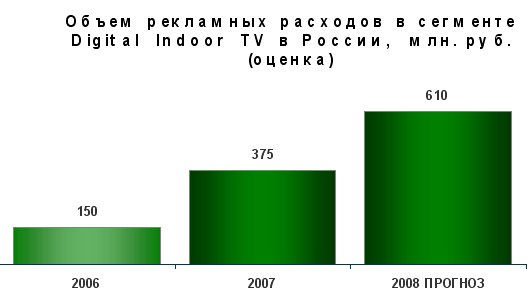 Стоит отметить, что за последние три года объем рынка Digital Indoor TV удваивался при практически неизменных ценах на размещение, что свидетельствует о наращивании рекламодателями не только бюджетов, но и физических объемов размещения. Примечательно, что даже в период резкого взлета цен на классические рекламные медиа (ТВ, наружная реклама) в 2006-2007 годах, в сегменте Indoor TV произошла даже некоторая коррекция цены вниз за счет увеличения количества рекламных площадей.