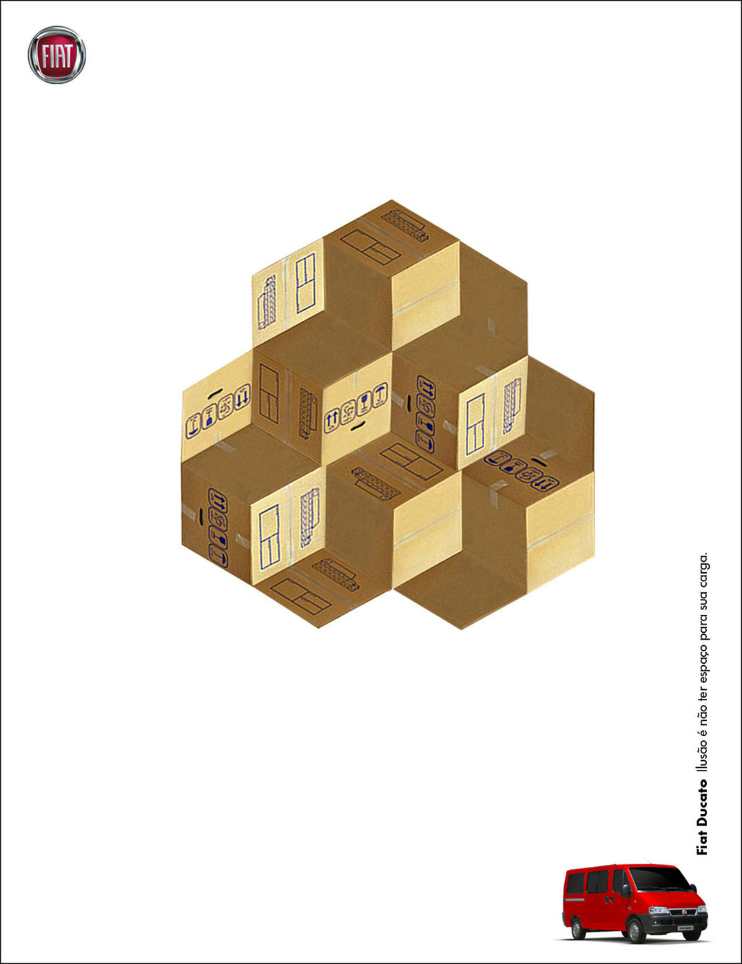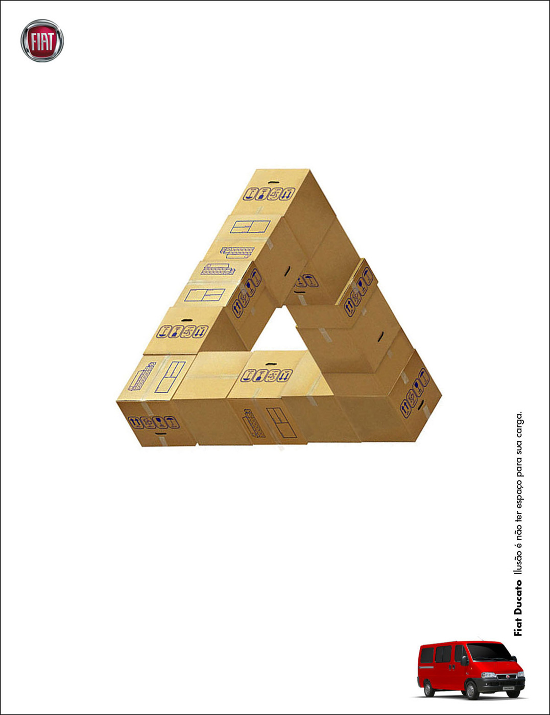 И снова метаморфозы Эшера не дают о себе забыть в рекламе FiatМолодые креаторы из бразильская школы рекламы Miami Ad School в своих новых принтах для автоконцерна Fiat решили использовать эффект метаморфоз Морица Корнелиуса Эшера. Отметим, что эта идея в рекламном бизнесе отнюдь не нова: нечто подобное предложили использовать бразильцы из креативного агентства Lew Lara\TBWA для Nissan, рассказывая ЦА о невероятной экономичности новой модели Nissan Tiida, также не так давно немецкое агентство Jung von Matt/Alster применило этот эффект для рекламы конструктора Lego. В этот раз идеи Эшера помогли креаторам проиллюстрировать, насколько вместительным может оказаться микроавтобус Fiat Ducato. Слоган: Illusion is not to have space for its load. Школа Рекламы: Miami Ad School, Сан-Паулу, Бразилия |