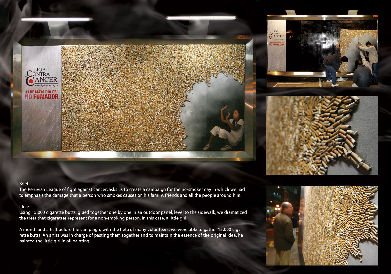 Агентство Ogilvy Peru собрало 15 000 бычковРекламные агентства уже давно потеряли надежду достучаться до курильщиков, запугивая их неизбежными болезнями и даже смертью. В последнее время мысли креаторов все чаще и чаще обращаются в сторону пассивного курения. Весь если человек не боится за собственную жизнь, то, возможно, он задумается о здоровье своей семьи и друзей.Исключением не является и эта социальная акция, разработанная перуанским рекламным агентством Ogilvy Peru для организации "Лига Против Рака" (Liga Contra el Cancer). По просьбе заказчика, креаторы показали страх маленькой девочки, выложив жуткую картину из 15 000 окурков, которые пришлось собирать в течение полутора месяцев до начала кампании. Агентство: Ogilvy Peru Творческий директор: Aldo Canchaya Арт-директор: Daniel Morales Копирайтер: Yacub Tabja, Diego Guzman Иллюстратор: Jose Antonio Bao |