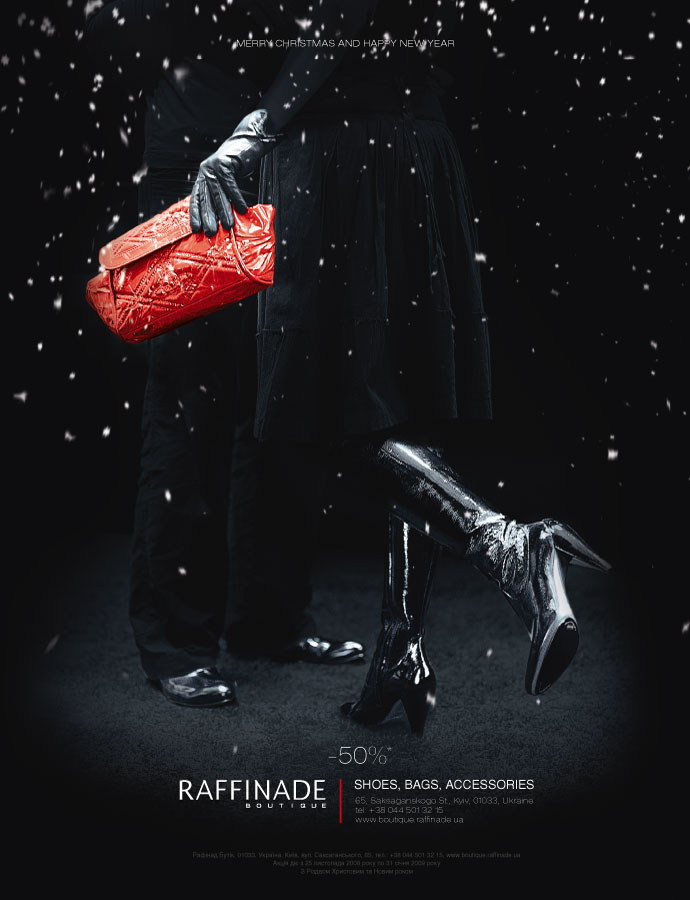 Face's советует встречать Новый Год в вещахТворческая команда креативного агентства Face's, в рамках предновогодней рекламной кампании, разработала серию работ для Raffinade boutique. Креативная концепция кампании не содержит стандартных дизайнерских клише и в интересной форме информирует о новогоднем подарке пятидесяти процентной скидке на стильные вещи.Это не первая серия работ агентства для этого клиента. Атмосфера легкого флирта, приглушенное освещение и индивидуальный дизайнерский стиль работ создают особое праздничное настроение и идеально передают волнующее предвкушение новогоднего чуда. Новый 2009 год для Raffinade boutique начнется с выхода новой рекламной кампании, разработанной Face's. |
