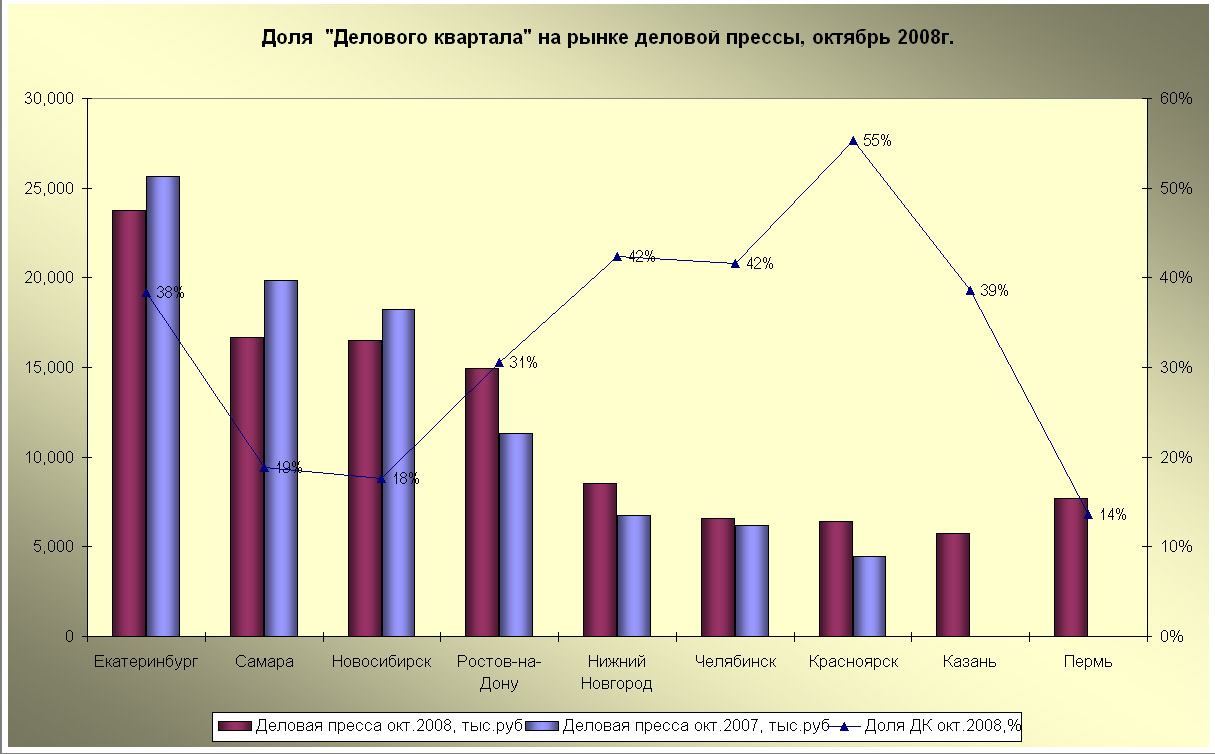 Деловая пресса в эпоху кризисаСлужба аналитики «Делового квартала» подвела итоги октября и 10 месяцев 2008 года рынков деловой прессы 9 городов Сети: Екатеринбурга, Новосибирска, Нижнего Новгорода, Ростова-на-Дону, Самары, Красноярска, Челябинска, Казани и Перми. Анализ проводился на основе данных отдела мониторинга ИД «АБАК-ПРЕСС». Методика ИД схожа с методикой TNS Gallup AdFuct: оценивается объем рекламы в деловых изданиях города в соответствии с действующими на момент выхода прайс-листами. Рынок деловой прессы, 10 месяцев 2008 года За 10 месяцев 2008г. рынок деловых печатных СМИ городов-миллионников России вырос в среднем на 17% по сравнению с тем же периодом 2007г. По-прежнему в тройку лидеров по объему рынка входят Екатеринбург, Новосибирск и Самара. Самая большая динамика роста объемов продаж наблюдалась на рынках Красноярска (+55%), Ростове-на-Дону (+32%) и Нижнем Новгороде (+28%). Рынок деловой прессы, октябрь 2008 года Кризисные события в октябре 2008 года по-разному отразились на рынках городов- миллионников. Тройка городов с самыми значительными бюджетами показали отрицательную динамику: Самара (-16%), Новосибирск (-10%), Екатеринбург (-7%). При этом рост бюджетов ДК в Самаре и Новосибирске составил +84% и 86% соответственно. В то время как остальные города в октябре стремительно росли: Нижний Новгород (+26%), Ростов-на-Дону (+32%) и Красноярск (43%). Лидеры рынка деловой прессы, октябрь 2008 года По итогам октября 2008г. «Деловой Квартал» занимает лидирующие позиции на рынке деловой прессы 6 городов Сети: Екатеринбург (38%), Красноярск (55%), Челябинск (42%), Нижний Новгород (42%), Ростов-на-Дону (31%) и Казань (39%). В Самаре и Новосибирске «Деловой Квартал» занимает на рынке деловых СМИ второе место с долей 19% и 18%, уверенно опережая приложения федеральных деловых изданий. В среднем ДК держит 31% рынка деловой прессы городов-миллионников. Первый номер в Перми вышел 29 сентября и уже в октябре ДК занял третью позицию на рынке. См. диаграмму 1. Диаграмма 1 Рекламные бюджеты За 10 месяцев 2008г. объем рекламных бюджетов в Сети ДК вырос на 50% по сравнению с тем же периодом Наталья Коптелова, директор сети «Деловой квартал»: «В октябре 2008г. подтвердились наши прогнозы: «Деловой квартал» уверенно лидирует на рынке деловой прессы Екатеринбурга, Красноярска, Челябинска, Нижнего Новгорода, Ростова-на-Дону и Казани. Второе место - в Новосибирске и Самаре, третье – в Перми. Отдельного внимания заслуживают показатели Казани и Перми. В этих городах издание было запущено только в 2008г: Казань - в апреле и Пермь – в сентябре. Всего 7 месяцев потребовалось Деловому кварталу, чтобы стать лидером в Казани. И за 1 месяц «Деловой Квартал» достиг уже третьей позиции в Перми, причем от ближайших конкурентов в Перми ДК отделяет всего 3%. Думаю, что ДК сможет стать твердым лидером пермского рынка уже к середине следующего года. Главное, что показывают итоги октября 2008г.: при качественной модели издания и грамотном управлении никакой кризис не страшен». |