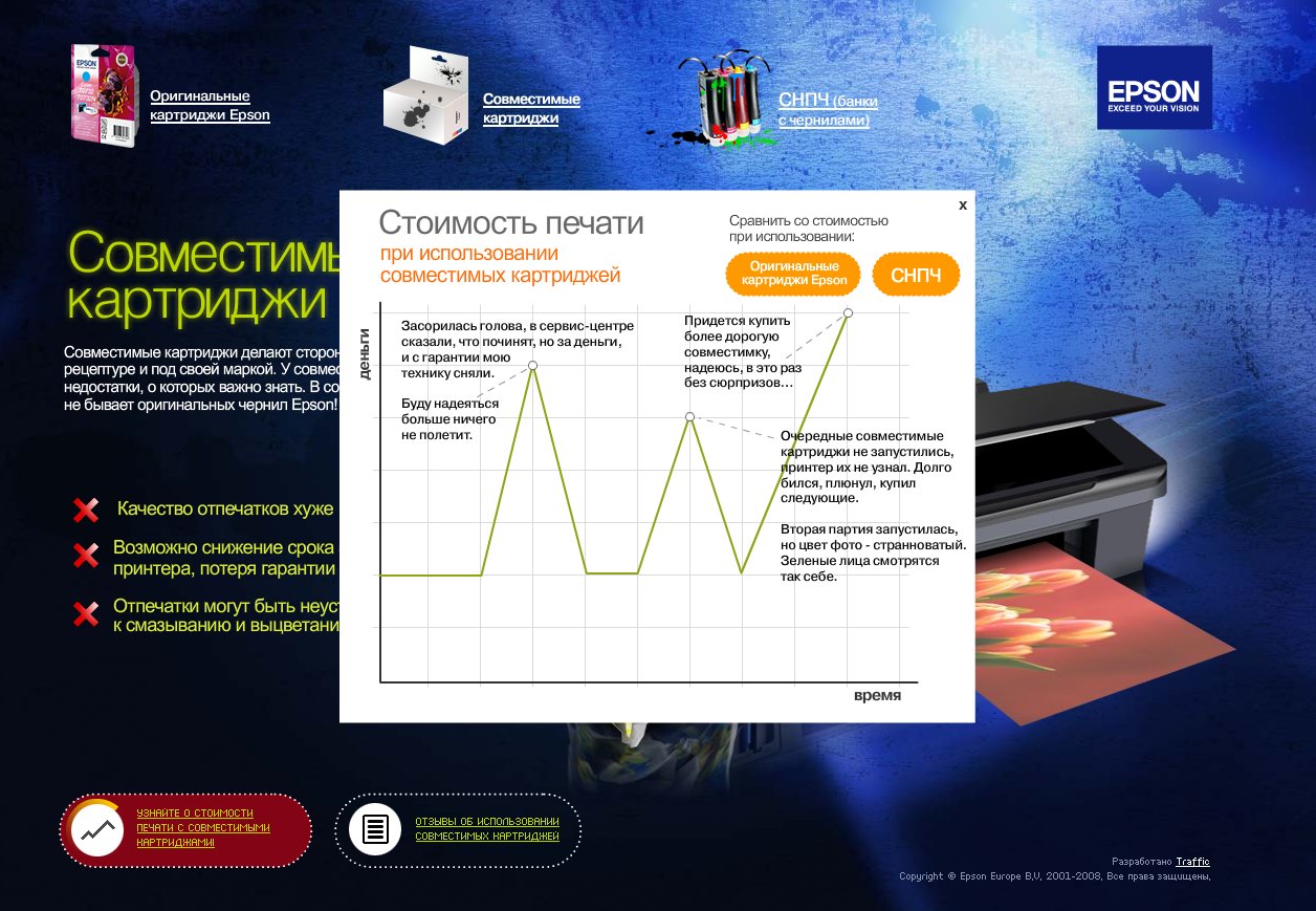 Epson и TRAFFIC учат правильной фотопечатиИнтернет агентство TRAFFIC разработало сайт для компании Epson - мирового лидера в области производства устройств для получения изображения. Сайт посвящен фирменным картриджам Epson, производимым компанией для своих струйных принтеров.Посетителю сайта предлагается самостоятельно "вставить" тот или другой картридж в принтер, перемещая его с помощью мыши. После чего пользователя ожидает сюрприз - в зависимости от выбранной "заправки", он получит или идеальный отпечаток, или полутемную копию, или окончательно сломает свой принтер. Посетители сайта могут почерпнуть не только информацию о технологиях печати, но и увидеть наглядный график затрат на печать с разными средствами. Тут же можно почитать отзывы других пользователей об использовании оригинальных картриджей Epson. "Задача агентства - с помощью визуальных образов продемонстрировать преимущества товара. Для этого мы использовали как образы, так и цветовые решения. Развлечение с "заправкой" принтера при помощи мыши добавляет элемент интерактивности в коммуникацию с посетителями сайта, что всегда является преимуществом" - говорит Валерий Сивцев, креативный директор агентства TRAFFIC. |