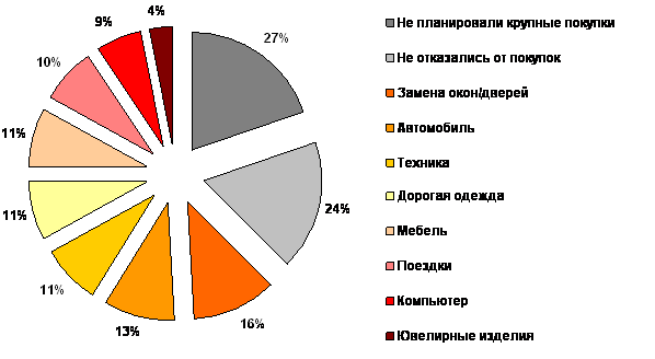 Россияне будут "затягивать пояса"Треть россиян отказались от запланированных крупных покупок В конце ноября текущего года исследовательский холдинг «Ромир» в ходе онлайн-опроса поинтересовался у россиян от каких крупных покупок, запланированных на осень 2008-го года, им пришлось отказаться. В опросе приняли участие 1500 человек, в том числе около 350 человек, имеющих высокий уровень дохода (более 25 тысяч рублей в месяц на каждого члена семьи). Три четверти участников исследования моложе 35 лет (но старше 18). Доля мужчин в выборке составляет 55%. Структура выборки полностью соответствует портрету российской интернет аудитории. Российские интернет-пользователи являются наиболее активной частью потребителей товаров длительного пользования и дорогих услуг. Они молоды, активны, имеют относительно высокие доходы и образование, проживают преимущественно в крупных городах. Прежде всего, стоит отметить, что более четверти участников опроса (27%) не планировали никаких крупных покупок на осень этого года. Соответственно, и отказываться им было не от чего. И, что характерно, этот процент не зависит ни от пола, ни от возраста, ни от профессионального статуса, ни даже от дохода. Т.е. отсутствие планов по крупным покупкам – это скорее поведенческая, психографическая характеристика респондента. Четверть опрошенных (24%) в целом (треть тех, у кого были планы по совершению крупных покупок) не стали отказываться от запланированных приобретений. Среди низкодоходной категории граждан (менее 10 тысяч рублей на каждого члена семьи) только 16% смогли реализовать свои планы по покупкам, среди высокодоходной группы (более 25 тысяч рублей на человека) – в два раза больше – 32%. Половина участников исследования (49%), а это две трети из тех, кто имел намерение совершить крупную покупку заявили, что они отказались от какого-то планировавшегося крупного приобретения.![]() «Отказались ли Вы, или члены Вашей семьи от каких-то крупных покупок, запланированных на осень 2008-го года?» Из приведенной диаграммы видно, что 16% опрошенных отказались от запланированного на осень 2008 года ремонта в своих квартирах (замены окон или дверей), 13% перенесли на более поздний срок приобретение нового автомобиля, 11% не стали приобретать крупную бытовую технику, такое же количество респондентов (11%) отказались от покупки дорогой одежды, типа шубы и ровно столько же людей (11%) не купили мебель, каждый десятый (10%) отложил туристическую поездку, 9% не стали покупать новый компьютер, ноутбук, принтер, сканер и т.п. технику, а 4% опрошенных отказались от запланированной покупки ювелирных украшений. Здесь надо заметить, что покупка ювелирных украшений, особенно не очень дорогих, достаточно часто является незапланированной, спонтанной покупкой. Результаты исследования комментирует Член Совета директоров «Ромир», Президент Гильдии Маркетологов Игорь Березин: «Полученные данные не следует воспринимать линейно, как прямое свидетельство сокращения спроса в два раза, и более в течение осени 2008-го года. Скорее, речь может идти об изменении в настроениях наиболее активной части потребителей, о психологической реакции на кризис в экономике страны. Реальные итоги осени в плане продаж товаров длительного пользования, скорее всего, будут положительными: рост по сравнению с осенью 2007-го года на 8-13%. Это конечно 