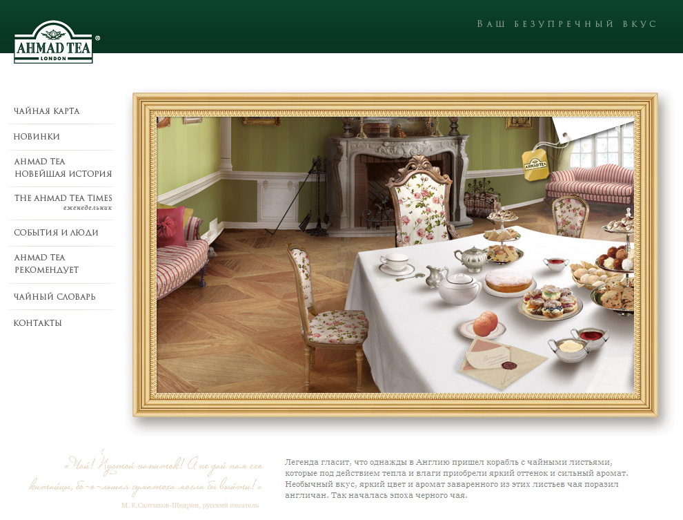 Чай «Ахмад» с квестамиКомпания Ahmad Tea Ltd. 1 декабря запускает обновленную версию сайта для торговой марки Ahmad Tea в России. Интерактивный формат коммуникации с пользователями заключен в наличии виртуального тура, современной веб-технологии, которая создает 3D-пространство для виртуального путешествия. На главной странице сайта www.ahmadtea.ru в золотой раме «висит» картина, которая оживает при наведении курсора мышки. Картина – это гостиная королевы Виктории, где за большим чайным столом собрались на знаменитый Five o'clock и сама Королева, и ее гости. Каждый герой «путешествия» – своеобразный типаж, который сыграл роль в истории английского чаепития: титестер (эксперт по чаю), дворецкий, капитан чайного клипера, девочка Алиса из книжки Л.Кэрролла, Анна Бедфордская, положившая начало Five o'clock, и кошка. О последней – чтобы увидеть кошку пользователю необходимо пройти небольшой забавный квест, «приключение с целью», где заданием является оживить героев, заставить кошку присесть за чайный столик и начать чаепитие. Кликнув на любого участника чаепития, можно узнать о его занятиях, и чем он знаменит. Помимо квеста «Английское чаепитие» дает возможность в краткой, сжатой форме узнать несколько познавательных фактов из истории чая вообще и Ahmad Tea в частности, так как многие предметы «откликаются» на курсор небольшими текстами. Новый сайт разработан компанией Neq4. |